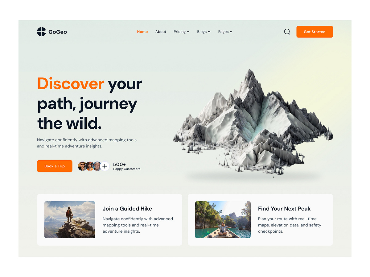 Explore GoGeo, a modern adventure travel website design featuring a bold hero section, 3D mountain illustration, and clean UI/UX layout. Perfect for travel brands and agencies seeking impactful web experiences.-Work Inquiries
