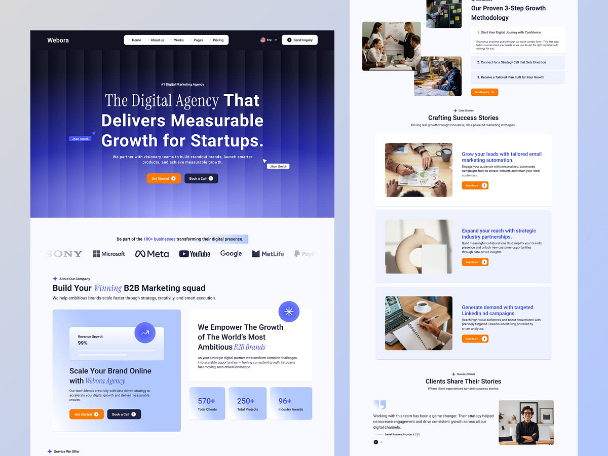 This homepage design is meticulously crafted for Webora, a high-impact digital agency specializing in delivering measurable growth for ambitious startups. It showcases a modern, professional layout that perfectly balances a high-contrast aesthetic with a conversion-focused structure.