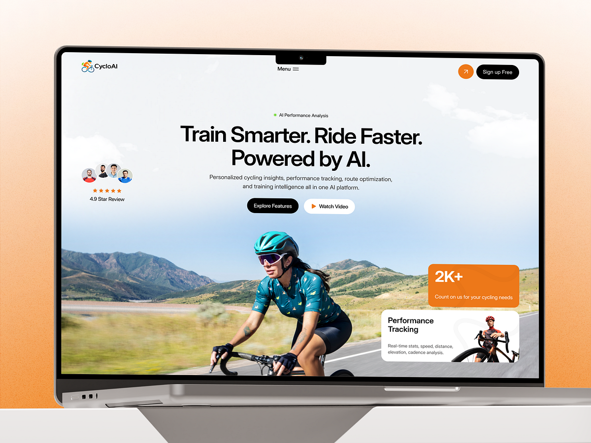 Cycling is no longer just about endurance, it’s data-driven. This website concept explores how AI can help cyclists train smarter, ride faster, and track performance with precision. Many fitness and cycling platforms overwhelm users with data while failing to clearly explain insights, progress, and real performance impact. A clean, modern AI-powered cycling website that presents performance analytics, training intelligence, and social proof in a clear, motivating way.