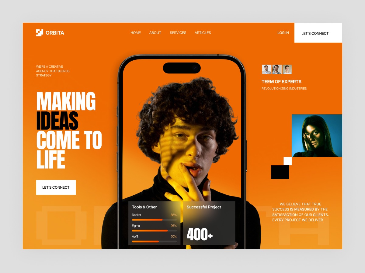 Introducing ORBITA — a bold creative agency concept built to turn ideas into powerful visual experiences. This hero section brings together our signature design language: vibrant orange energy, dynamic golden overlays, and a clean iPhone mockup that highlights key projects, metrics, and achievements. The layered composition adds depth, movement, and a premium modern feel—perfect for brands aiming to make a memorable first impression.