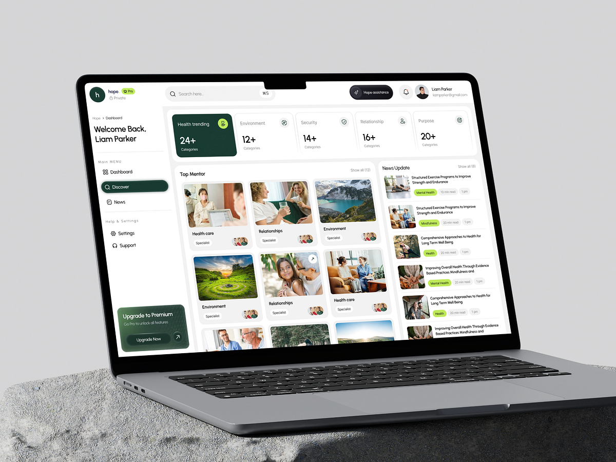Well-being isn’t one-dimensional, and neither should the experience be. This dashboard design brings health, relationships, environment, and purpose into one calm, structured interface. Most well-being platforms feel fragmented—too much content, unclear priorities, and little personalization. A unified dashboard that organizes wellness categories, mentors, and insights into a clear, supportive experience.