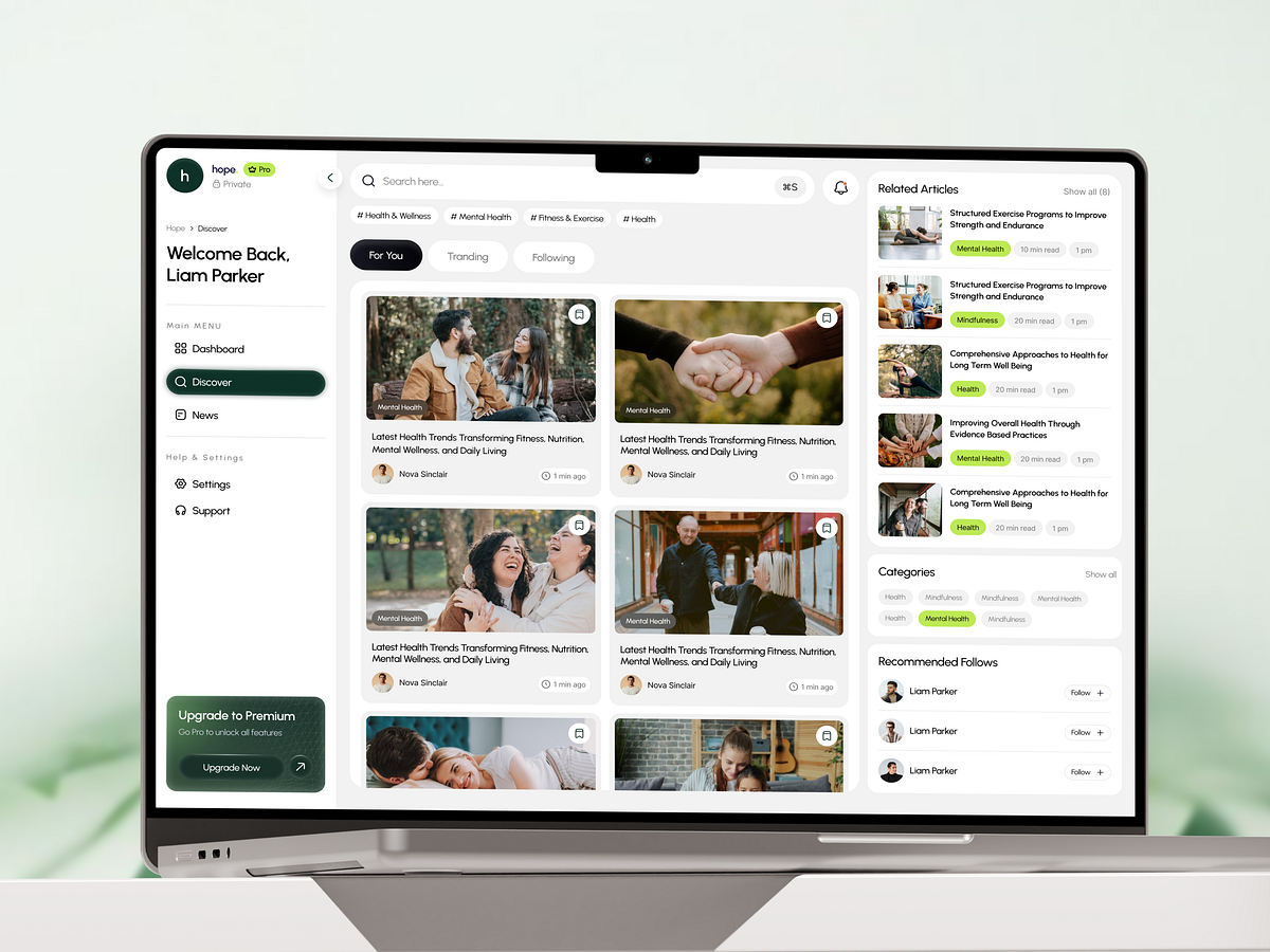 Wellness platforms work best when clarity meets calm. This healthcare dashboard design focuses on helping users discover health, mental wellness, and lifestyle content through a clean, organized, and human centered interface. Content heavy health platforms often overwhelm users with cluttered feeds, poor categorization, and unclear content hierarchy. This concept presents a health and wellness dashboard that organizes articles, categories, and recommendations into a structured, easy-to-browse experience.