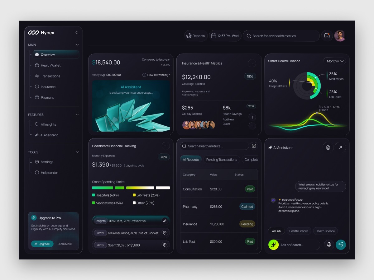 Hynex is a health finance dashboard that uses AI to simplify healthcare and financial management. It delivers real-time insights on spending, insurance coverage, and wellness metrics in one hub. Dark-mode dashboard showing insurance coverage, savings, spending limits, and charts with an AI assistant