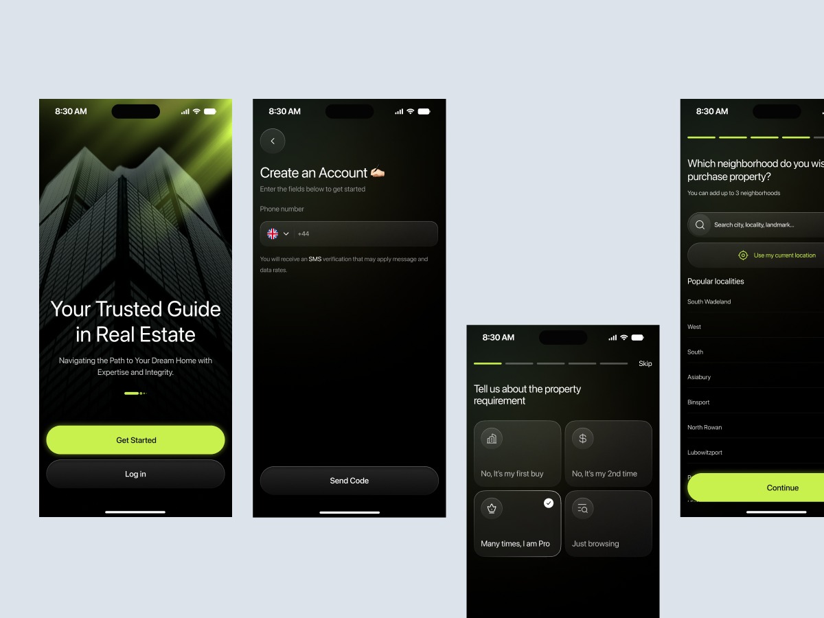 Your Trusted Guide in Real Estate A mobile app UI built for homebuyers, investors, and agents who demand clarity and trust.
