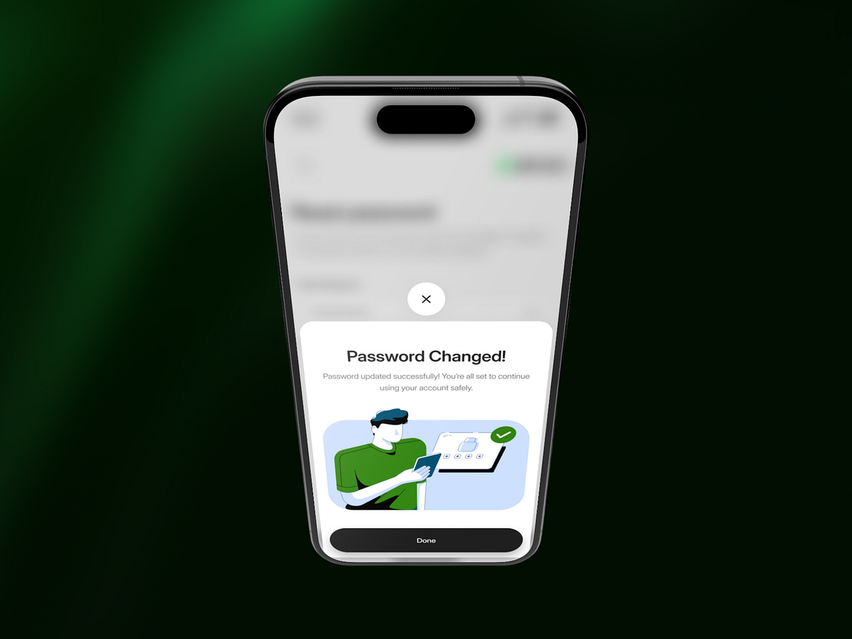 This password reset flow uses a clear form layout and simple instructions to help users update their credentials safely. Clean spacing and intuitive fields keep the process focused and frustration-free. A friendly success screen reinforces confidence with a clear message and supportive illustration. The design maintains a calm, modern tone that helps users feel secure as they complete their password update.