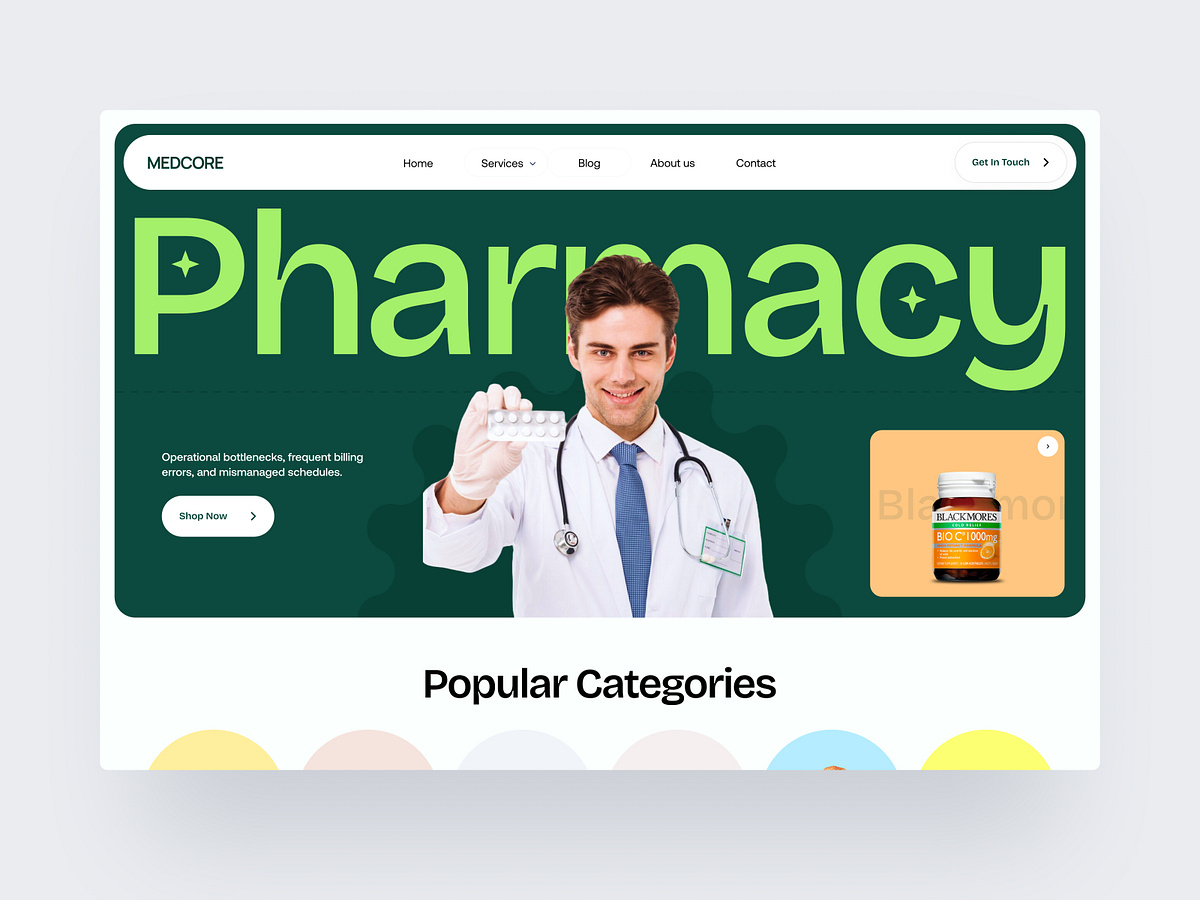 MEDCORE — Modern Pharmacy E-commerce Landing Page We designed MEDCORE, a modern and user-friendly pharmacy e-commerce landing page focused on making online medicine shopping simple, fast, and trustworthy. → Clear and intuitive navigation for effortless browsing → Strong hero section with clear health-focused messaging → Organized category sections for quick product discovery → Today’s best deals highlighted for instant attention → Featured brands to build trust and credibility → Clean product showcase with offers and discounts → Conversion-focused layout designed for ease and clarity A seamless digital pharmacy experience — crafted to help users find essential healthcare products quickly, safely, and with confidence.