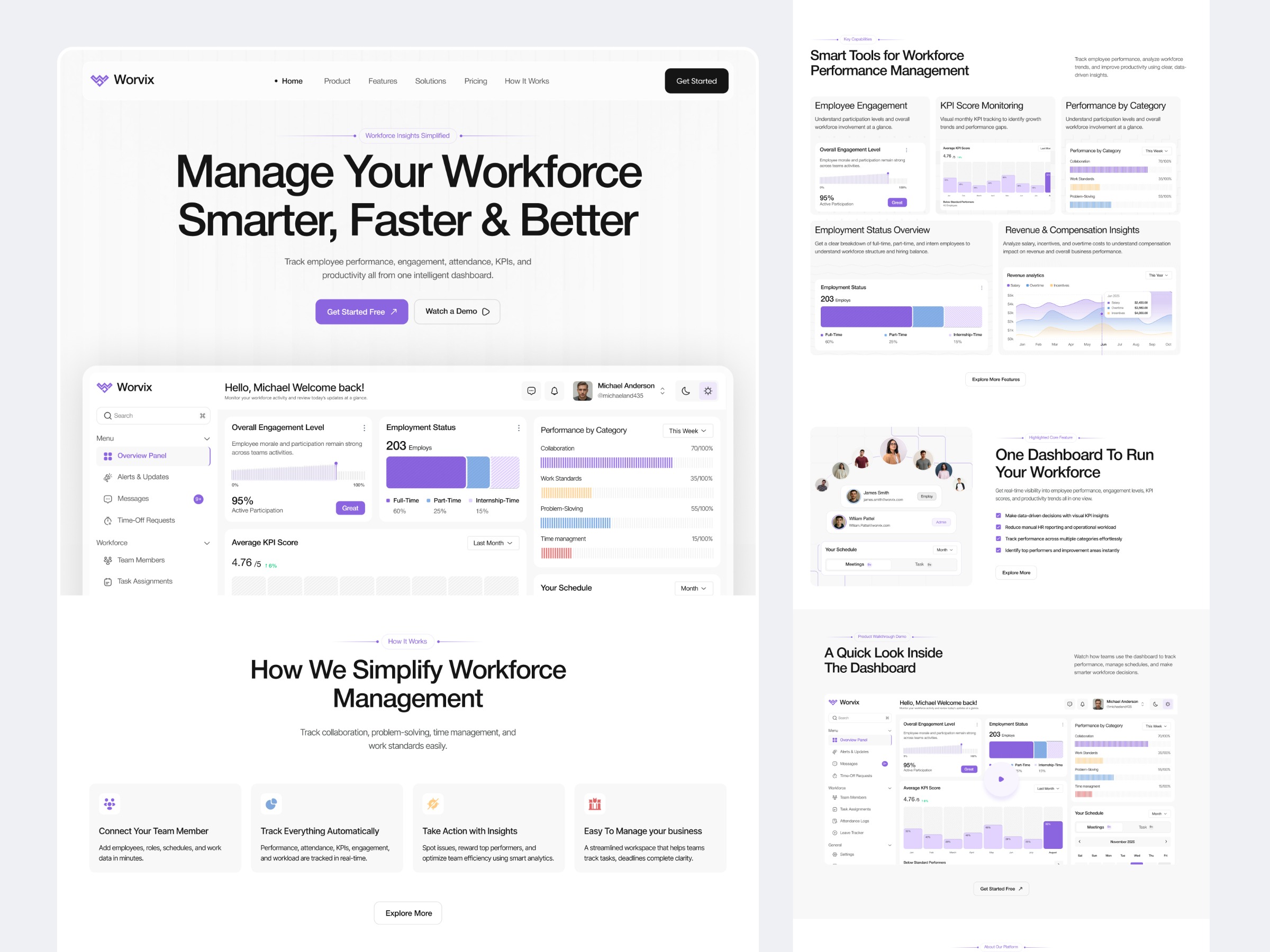 We designed "Worvix" a modern CRM & Workforce Management SaaS Landing Page built to help teams manage people, performance, and operations in one unified platform. → Centralized employee and workforce overview → Track performance, engagement, and KPI metrics in real time → Smart scheduling, task management, and attendance insights → Clean data visualization for faster decision-making → Modern, minimal UI designed for clarity, productivity, and scale A powerful workforce and CRM experience crafted to simplify team management and turn insights into action.