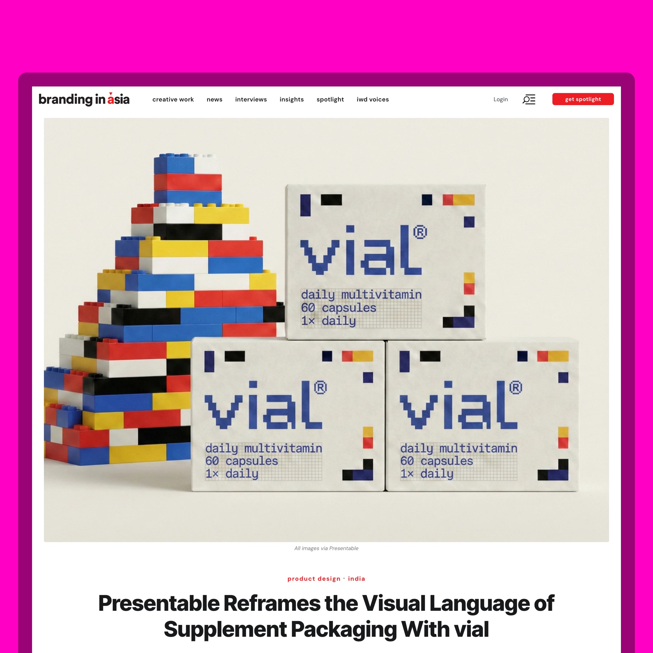 India-based design studio Presentable rethinks the visual language of supplement packaging through vial — a system built on modular grids, restraint, and quiet consistency. Moving away from urgency-led wellness branding, the work frames health as cumulative rather than corrective. A rational grid structure, pixel-informed typography, and minimal color interventions create a calmer, more deliberate visual language for everyday nutrition. Featured on Branding in Asia, the project reflects a shift towards clarity, consistency, and more thoughtful brand systems within the wellness category.India-based design studio Presentable rethinks the visual language of supplement packaging through vial — a system built on modular grids, restraint, and quiet consistency. Moving away from urgency-led wellness branding, the work frames health as cumulative rather than corrective. A rational grid structure, pixel-informed typography, and minimal color interventions create a calmer, more deliberate visual language for everyday nutrition. Featured on Branding in Asia, the project reflects a shift towards clarity, consistency, and more thoughtful brand systems within the wellness category.