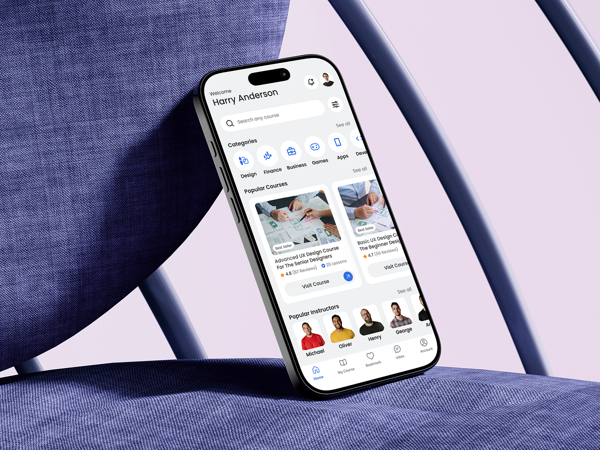 Designing this EdTech Online Learning Mobile App – Home Screen started with one core question: How do we help learners decide what to learn next in just a few seconds? The home screen is often the most overloaded surface in learning apps. My approach was to reduce cognitive load while increasing decision confidence. Instead of pushing everything at once, the layout follows a clear visual hierarchy: a welcoming personalized header, a prominent search entry, followed by structured learning categories and socially validated popular courses. Category icons are intentionally minimal and evenly spaced to support fast scanning. I avoided long text blocks and relied on recognizable visual cues so users can instantly identify their learning intent. Course cards balance credibility and clarity—ratings, reviews, and lesson counts help users evaluate value without opening details. One challenge was balancing exploration vs. guidance. To solve this, I placed popular courses and instructors strategically—supporting both self-directed discovery and system-assisted recommendations. This screen isn’t just about aesthetics—it’s designed to shorten time to learning, reduce drop offs, and gently guide users toward meaningful progress. If you were designing this home screen, what would you prioritize first: discovery, personalization, or motivation?