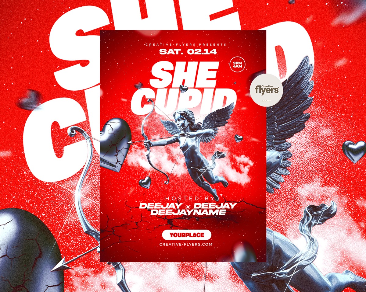Download the She Cupid PSD flyer template. Perfect for Valentine’s club nights, featuring 3D chrome graphics and fully editable layers for professional designers. "By @creativeflyers"