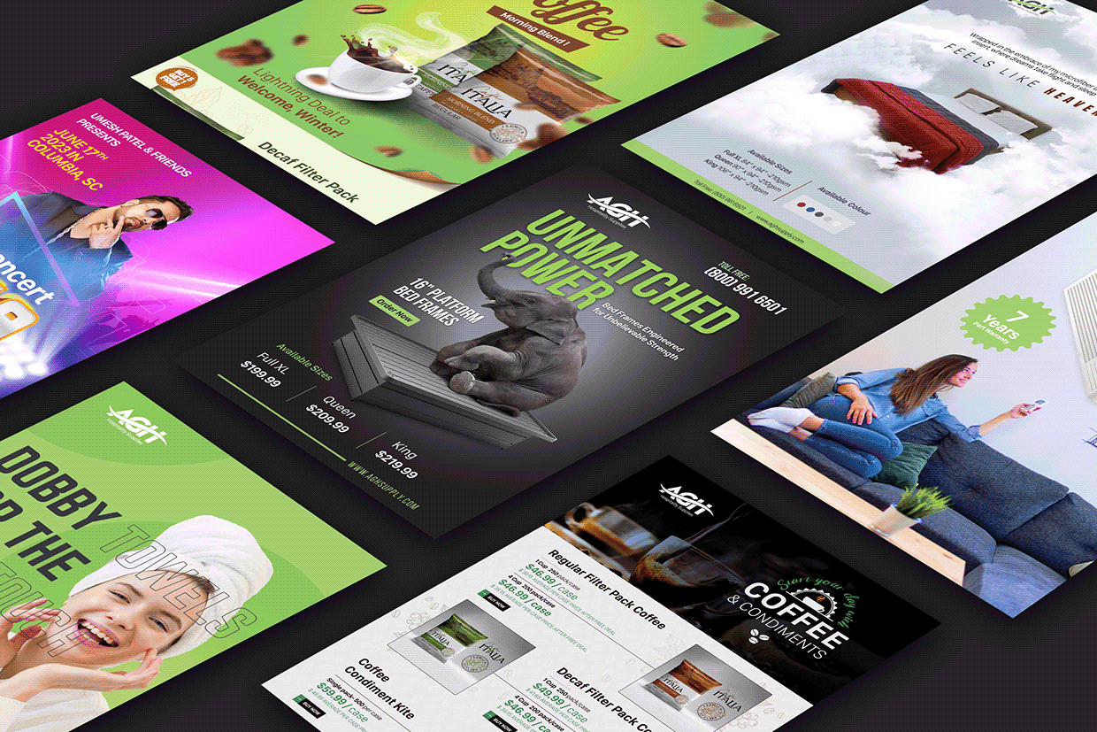 A dynamic collection of product-focused and promotional creatives designed for AGH Hospitality Supplier. This set includes visually rich layouts for coffee blends, bed frames, towels, appliances, event promotions, and lifestyle imagery—each crafted to highlight product value with a bold, modern aesthetic. The designs blend strong hierarchy, vivid color palettes, clean typography, and engaging compositions to elevate brand presence across digital platforms. From high-impact promotional posters to minimal product showcases, this collection reflects versatility, consistency, and a polished visual identity tailored for the hospitality market.