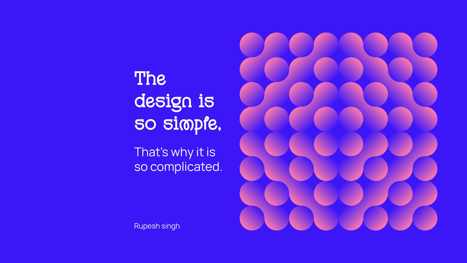 This artwork contrasts clarity and complexity using bright neon blue paired with soft pink-orange spheres. The playful type combined with structured rhythm creates a poster that feels alive and thoughtful. Inspired by the idea that simple design requires the most thinking, this piece celebrates balance, harmony, and modern digital aesthetics.