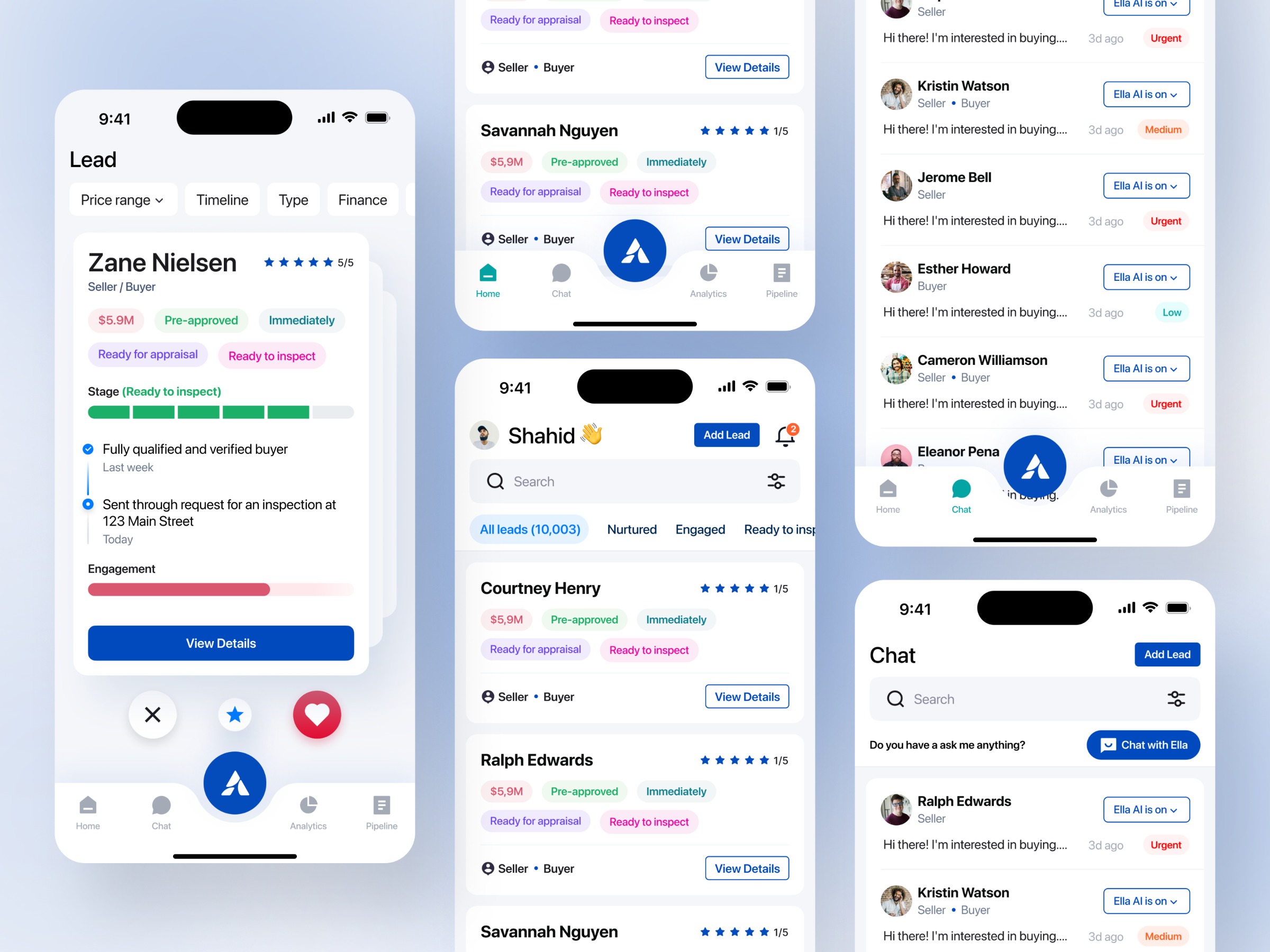 AgentAmp is built to help real estate agents manage leads, conversations, and deal stages in one organized workflow. From first contact to closing, every screen is crafted to improve clarity, speed, and agent productivity. → Smart lead profiles with status, score, and engagement insight → Pipeline stages showing readiness for appraisal, inspection, and approval → Chat system for quick follow-ups and seamless client communication → Lead list with filters for nurtured, engaged, or ready-to-inspect clients → Clean, modern UI that elevates daily real-estate operations