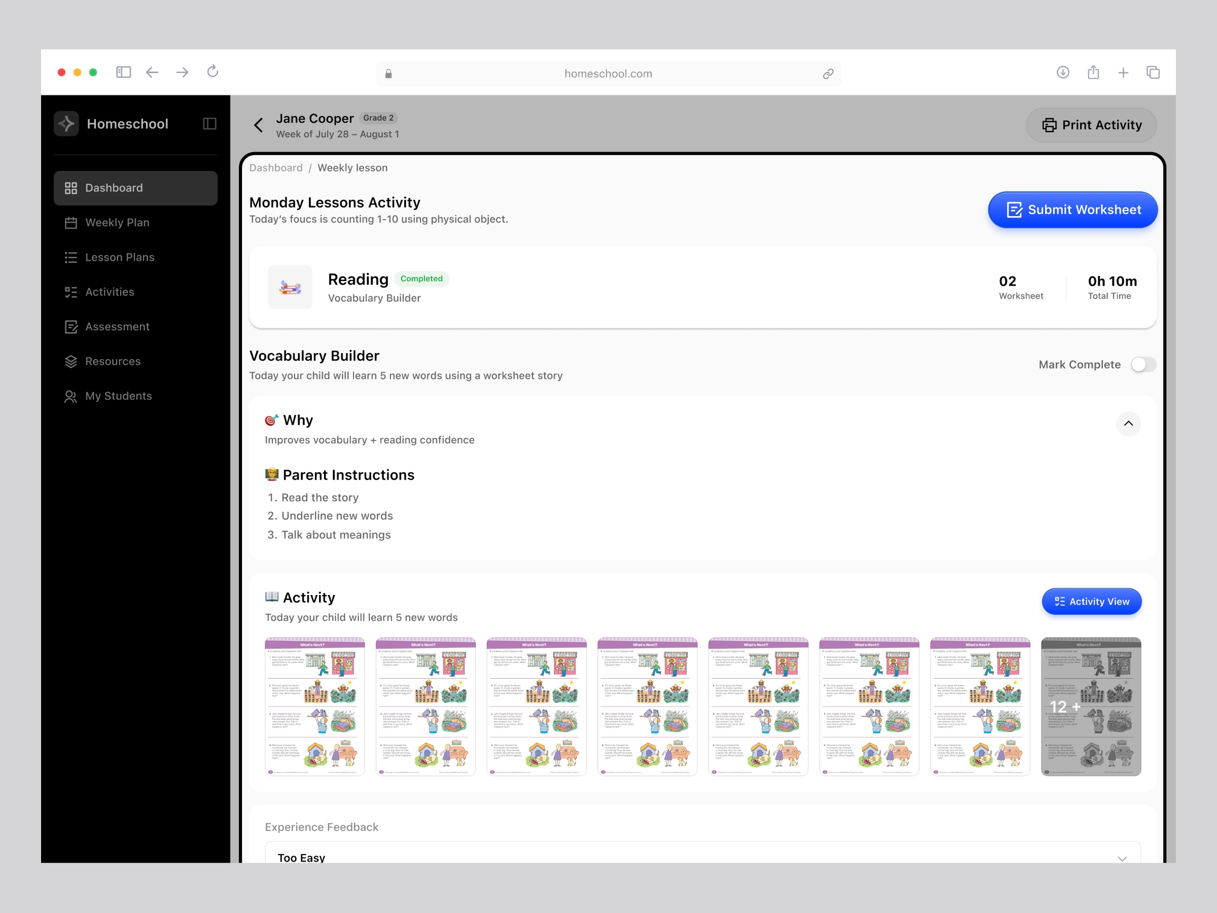 The Homeschool Dashboard is designed to help parents and educators monitor student learning through organized lesson summaries and progress tracking. → Track weekly lessons and subject progress in real time → View completed worksheets and total study time → Support parents with guided instructions and feedback tools → Visualize learning through activity-based summaries → Clean and structured dashboard for easy navigation This design helps parents and teachers stay connected to student progress, ensuring each learning journey is more personalized, focused, and rewarding.