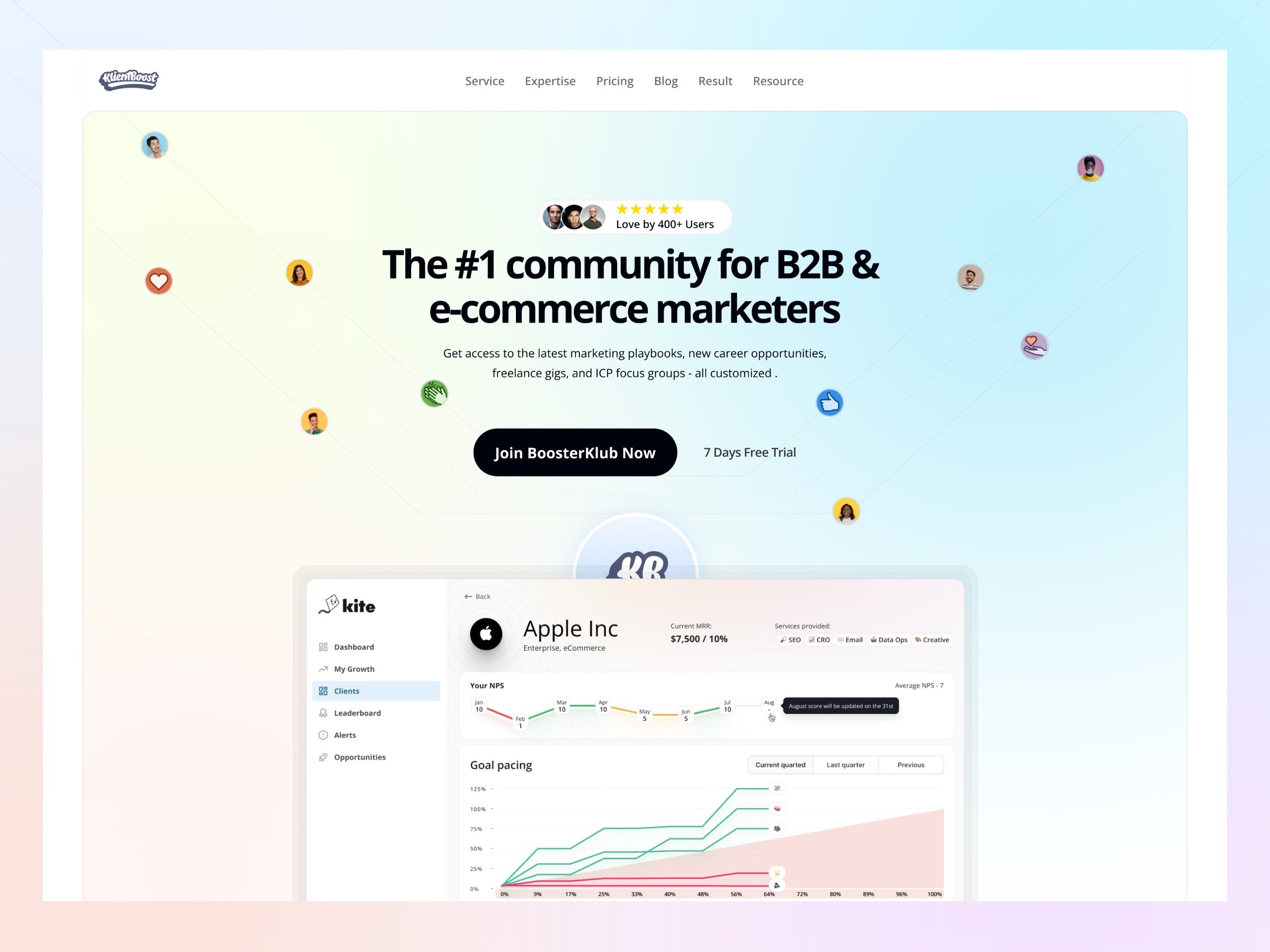Meet KlientBoost, a modern growth community built to empower B2B and eCommerce marketers with the resources, playbooks, and insights they need to scale faster. → Smart hero section highlighting community trust and social proof → Curated marketing resources, career tools, and ICP focus groups → Clean dashboard visuals showcasing client growth metrics → Optimized layouts for content libraries, courses, and FAQs → Modern, gradient-driven interface crafted for clarity and engagement