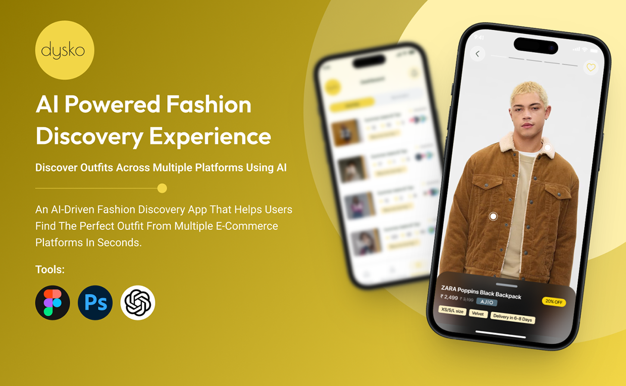 Dysko is an AI-powered fashion discovery app that aggregates clothing and accessories from multiple e-commerce platforms — Myntra, Ajio, Amazon, and Meesho — into a single, seamless interface. Users simply type or speak a style command and Dysko instantly surfaces matching products from all platforms, side by side. A swipe-based shortlisting mechanic makes it easy to compare and save favorites, while the unified cart lets shoppers visit any platform in one tap. This case study covers the full design process: competitive research, problem definition, user flow mapping, high-fidelity UI design, and a complete design system including typography, color tokens, grid framework, and iconography. Tools: Figma · Adobe Photoshop · ChatGPT