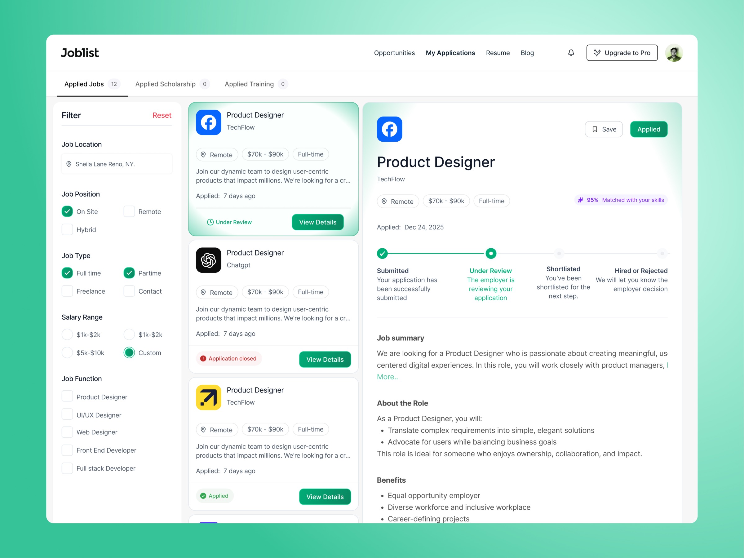 A modern, user-friendly dashboard interface designed for users to track, manage, and understand their job applications in one convenient location. The design emphasizes clarity, visibility of status, and simple navigation, enabling users to stay organized without feeling overwhelmed. Key Highlights: → Centralized dashboard for all job applications → Clear application status with step-by-step progress tracking → Smart filters for role, location, job type, and salary range → Job cards with essential details for quick scanning → Skill-match indicator to show relevance at a glance → Minimal layout with generous spacing for readability → Soft color accents to highlight actions and status changes → Designed for fast decision-making and stress-free tracking This dashboard transforms job hunting into a clear, organized process, ensuring users stay informed, focused, and in control throughout their application journey.