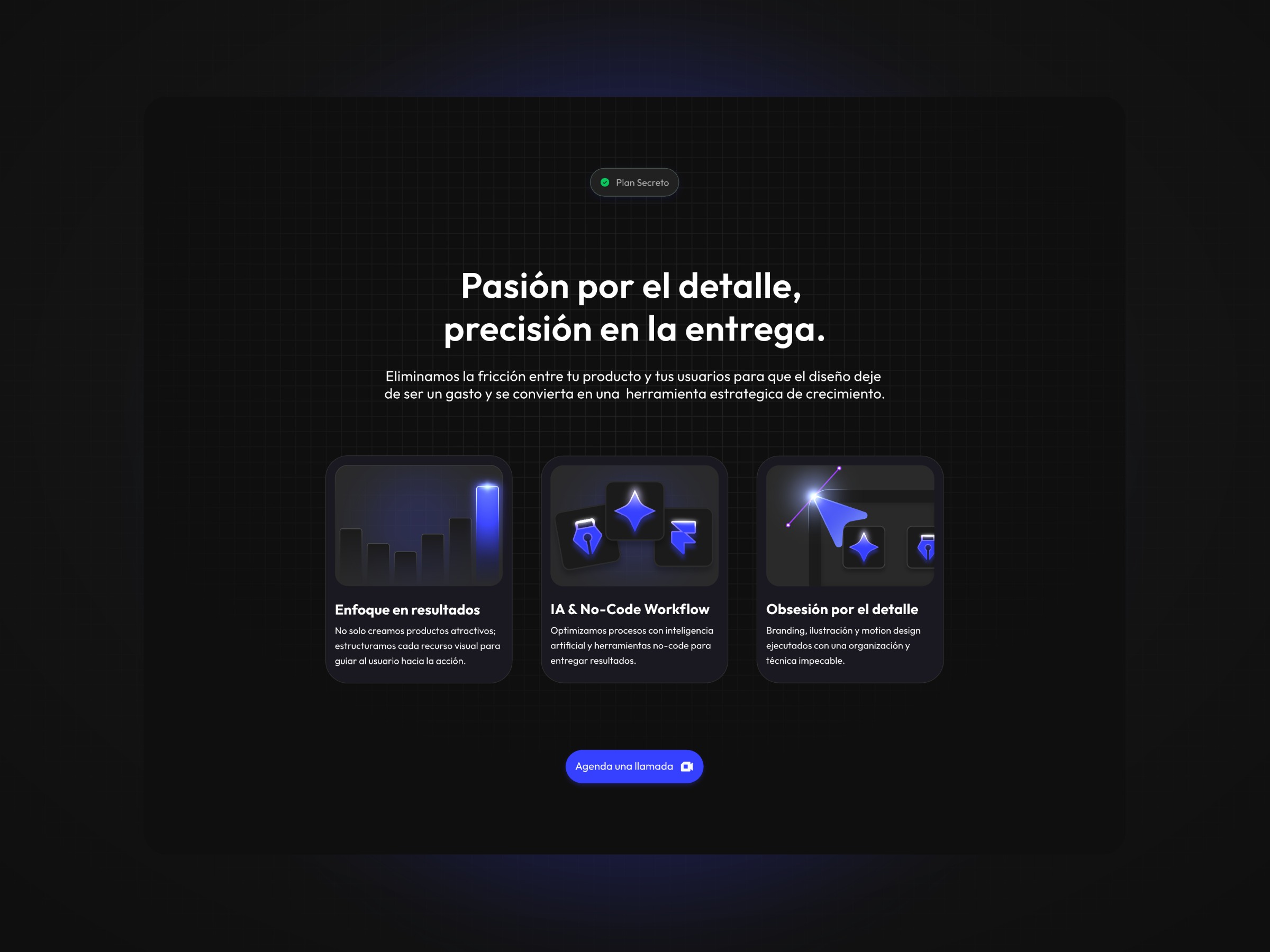 Hey Hey Hey 👋, I've been working on the Dosmas Studios website for a few days and wanted to share one of the sections that I've really enjoyed doing, the truth is I like making this type of bento illustrations. In this section I want to show the client what our mindset is when tackling projects, I prefer to call it the Studio's DNA, focus on conversion, meticulous care in the details, powered by AI and by no‑code.
