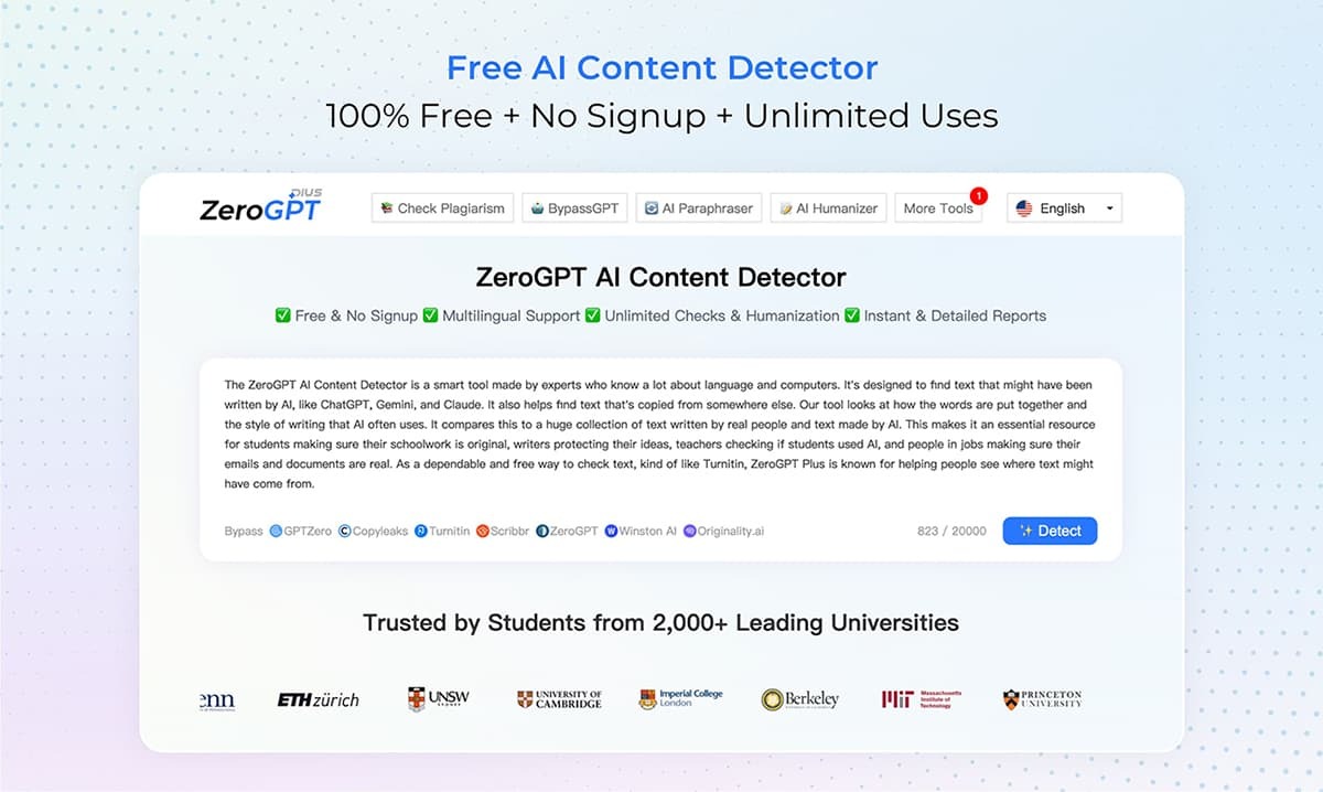 ZeroGPT Plus is a free AI Content Plagiarism Checker that doesn't require a login. It's designed to spot content created by AI tools like ChatGPT, Gemini, Claude, and Copilot. Using advanced technology, it checks texts against a large database to find signs that content might have been generated by AI. Plus, this tool can also make AI-written content sound more human and natural. You can even choose from different languages and styles to suit your needs.
