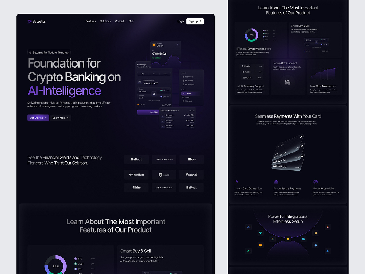 We designed ByteBits — an AI-powered crypto banking & trading SaaS landing page built to simplify digital assets and enable smarter financial decisions.→ AI-driven crypto banking and intelligent trading tools → Real-time portfolio tracking and performance analytics → Smart buy & sell automation powered by data insights → Secure multi-currency wallets with transparent transactions → Dark-mode, modern UI with futuristic SaaS visuals and UI cardsA next-generation crypto finance experience designed to make digital banking smarter, safer, and effortlessly scalable.