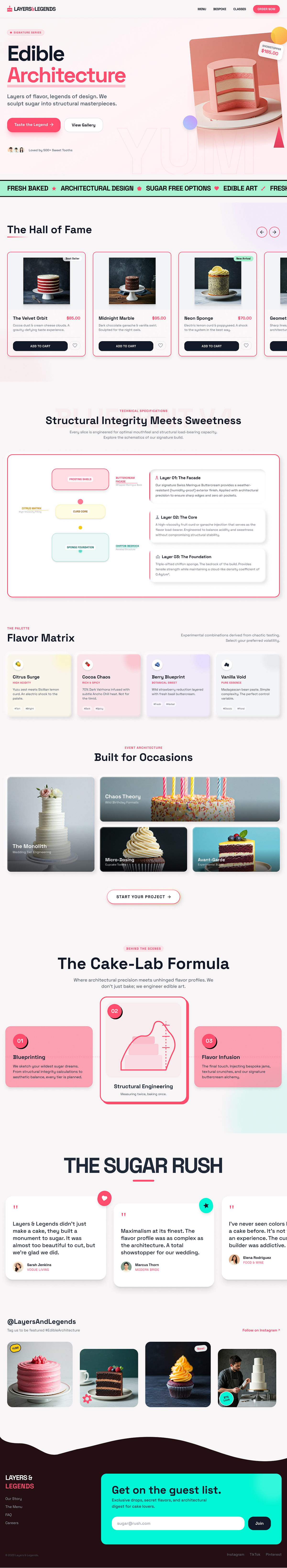 Layers & Legends — Cake Boutique Website Concept Not just cakes. Edible Architecture. A premium cake boutique UI designed with a Pastel Maximalism aesthetic — blending bold geometry, claymorphism, and sugar-high energy into a polished, high-end brand experience.