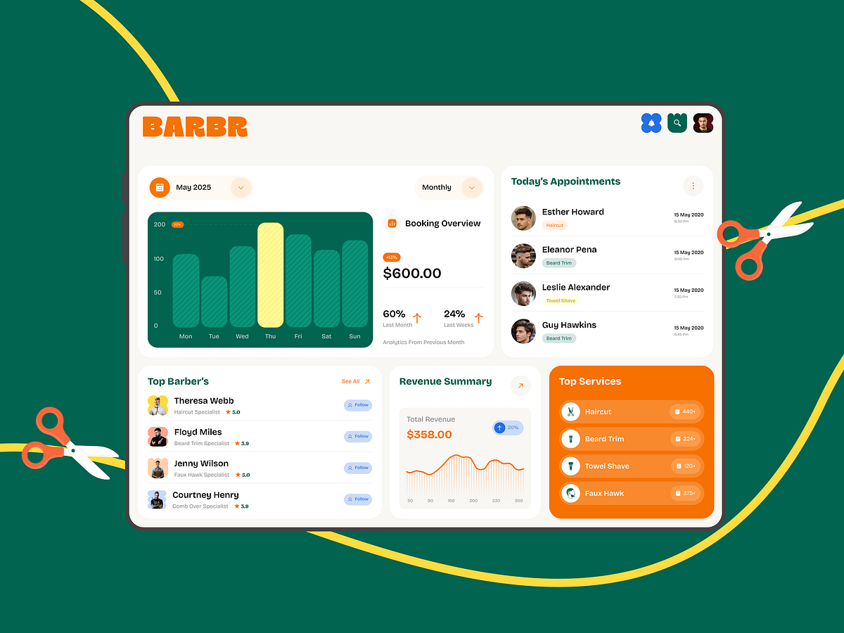 The BARBR Admin Dashboard is a clean, structured control panel designed to help barbershops manage bookings, track barbers, and monitor revenue with a modern, easy-to-use, and data-focused interface.