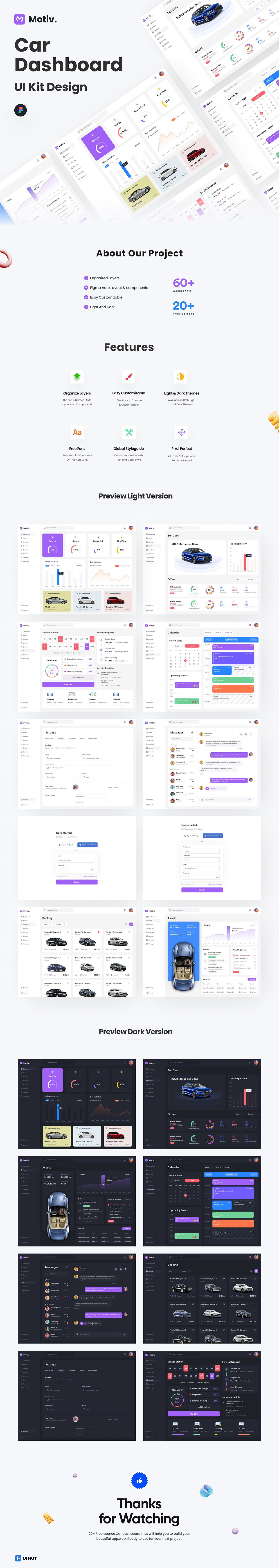 Motiv. is a Free Car Dashboard UI Kit Design of 20+ Free pixel-perfect screens and 60+ Components easy to use in Figma. The UI Kit is suitable and easy to fully customize for any kind of car dashboard, car booking and related projects, also the screens is usable for other product design as well. all Figma features, including global color, font styles, dynamic components & variants. Available in Light & Dark Theme. Thank you for Enjoy Free this UI KIt