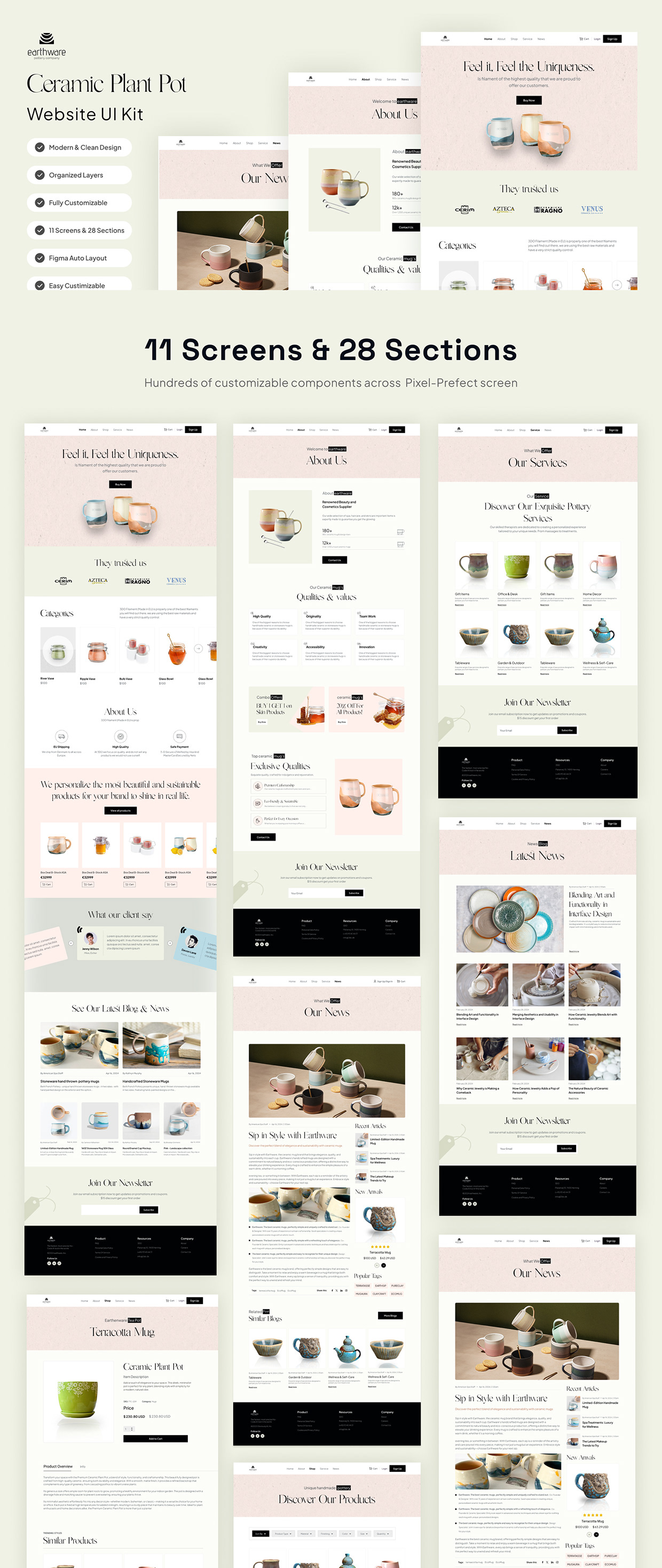 Transform your ceramic plant pot brand with Earthware, a sleek and customizable Website UI Kit. Featuring 11 screens and 28 sections, it includes pages like Home, Shop, About Us, and Product Details to create a visually captivating and user-friendly website. Designed for seamless navigation and modern aesthetics, this web design toolkit is perfect for home decor and eco-conscious businesses. With organized layers and UI design templates, Earthware ensures a polished online presence that boosts your brand’s appeal.