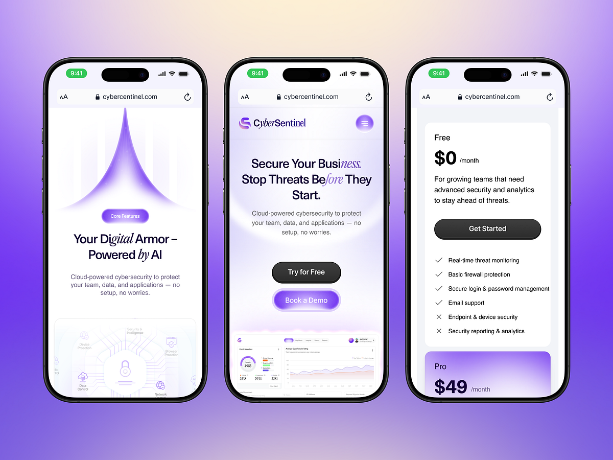 Client’s RequestWe wanted a visually compelling, trust-building landing page for CyberSentinel. It needed to evoke clarity and confidence, guide users intuitively, and be fully responsive across devices.