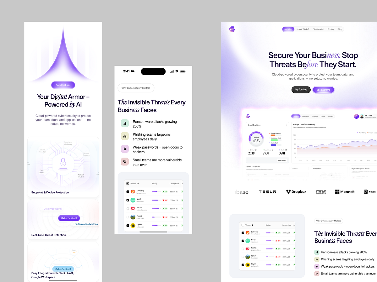 Client’s RequestThe client requested a responsive SaaS landing page design that communicates trust, security, and modern AI-powered protection. The key focus was to ensure clarity of messaging, a clean information hierarchy, and adaptability across desktop and mobile screens.