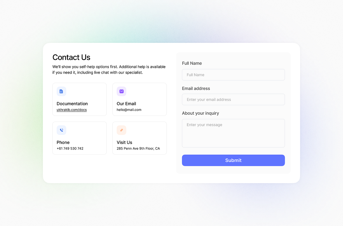 A concept for a clean and user-friendly "Contact Us" page. Designed to provide quick support and a simple contact form.