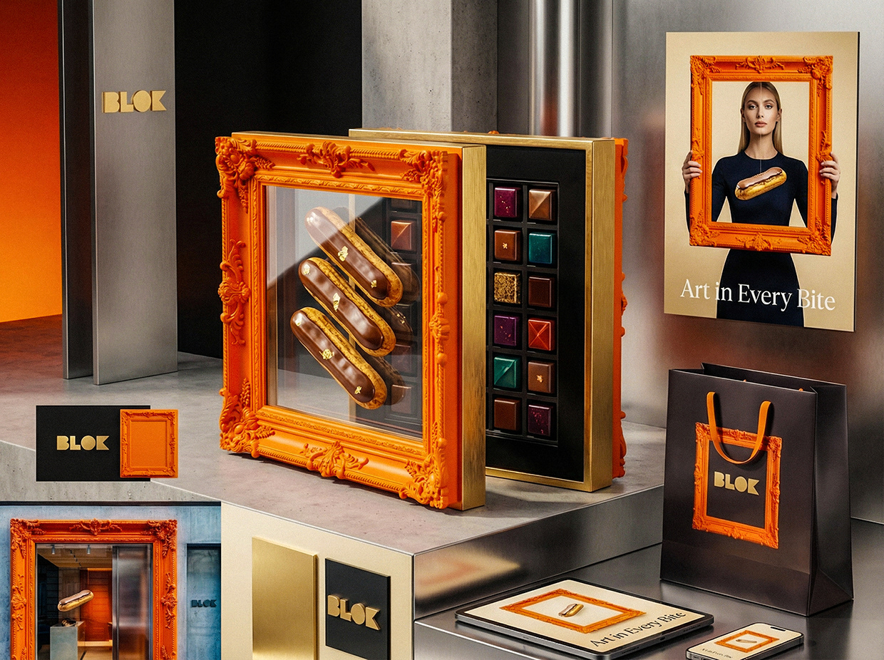 BLOK is a conceptual Parisian pastry brand that transforms the éclair into edible art. Bold orange baroque frames encase exquisite pastries against raw concrete, merging classical opulence with brutalist minimalism. "A Work of Art You Can Eat" — where luxury meets irreverence, tradition is reimagined, and every bite is a framed masterpiece. Français BLOK est une marque conceptuelle de pâtisserie parisienne qui élève l’éclair au rang d’œuvre d’art comestible. Des cadres baroques orange audacieux encadrent des pâtisseries raffinées sur fond de béton brut, fusionnant opulence classique et minimalisme brutaliste. « Une œuvre d’art que l’on peut manger » — où le luxe rencontre l’irrévérence, la tradition est réinventée, et chaque bouchée est un chef-d’œuvre encadré. BLOK 是一个概念巴黎烘焙品牌,将闪电泡芙转化为可食用的艺术品。 大胆的橙色巴洛克框架将精致甜点包围在原始混凝土背景下,融合古典奢华与粗野极简主义。 “一款你可以吃的艺术品”——奢华遇上不羁,传统被重新诠释,每一口都是被框定的杰作。