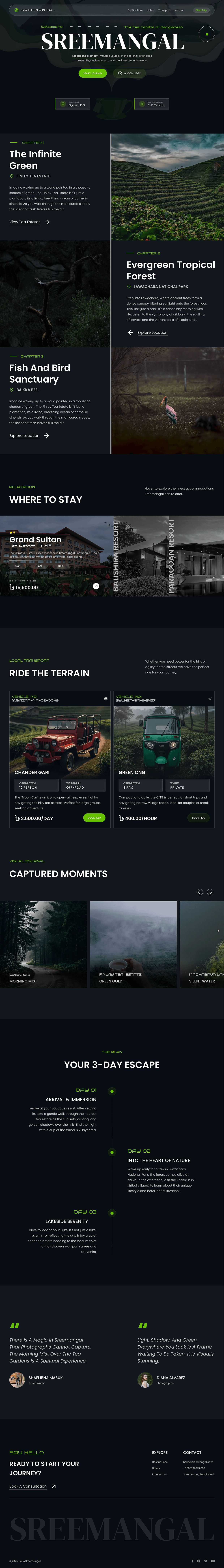 This is an immersive travel website designed to capture the unparalleled, mystic beauty of Sreemangal, the tea capital of Bangladesh. Moving away from typical bright travel sites, this design focuses on channeling the region's true environment—lush, moody, and deeply mysterious. We utilized a Deep Dark UI (User Interface) approach. The black and deep charcoal background allows the vibrant, high-contrast photography to truly pop, giving the entire experience a far more dramatic and premium feel than standard travel websites. This design doesn't just present information; it sells the mood of the destination.