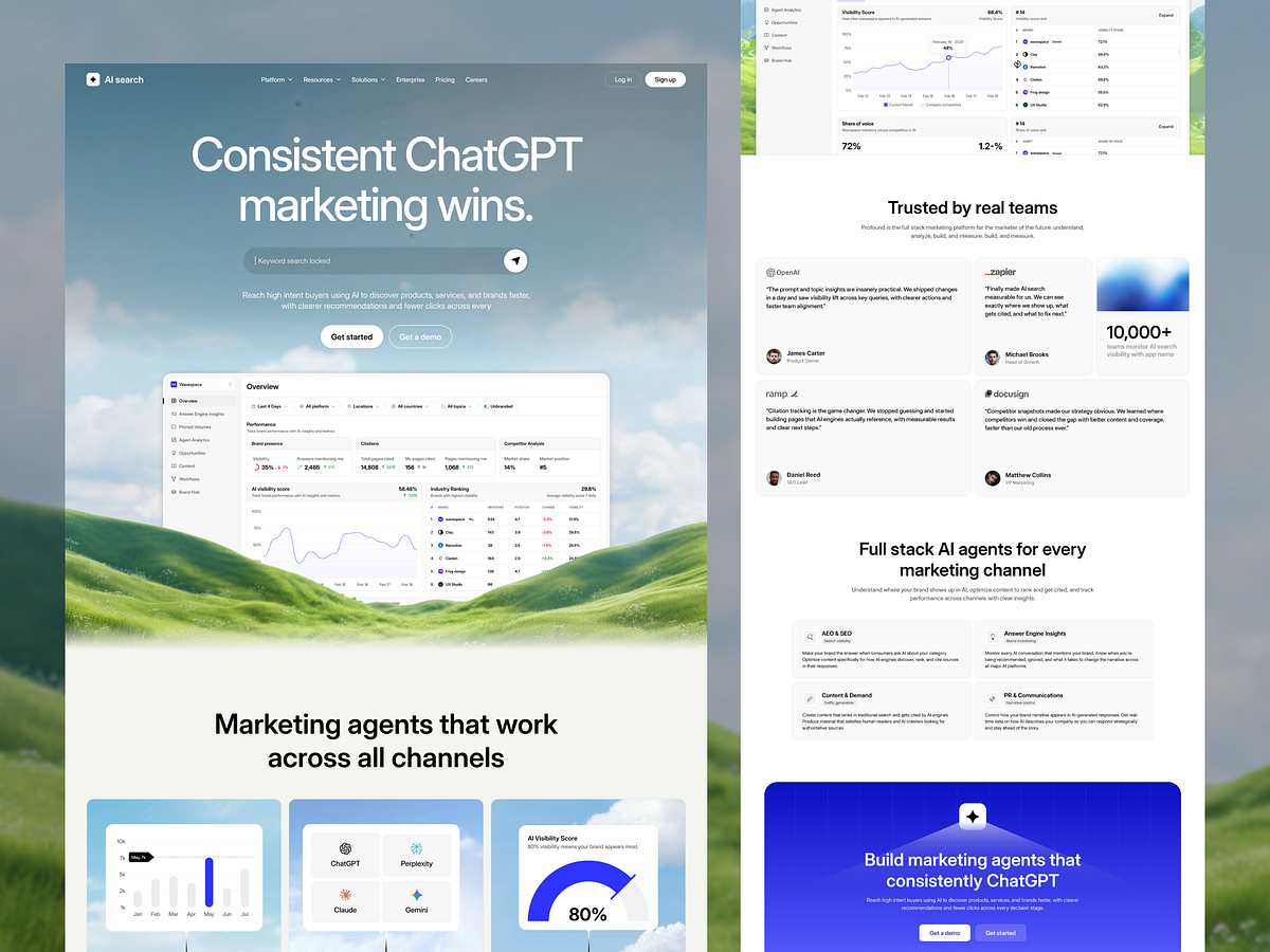 AI Search Visibility SaaS, designed by Wavespace, helps teams track brand mentions, rankings, and growth across AI platforms. It turns scattered data into clear performance insights for faster decisions.The web design uses a calm gradient hero with a focused landing page structure. A strong headline, search input, and preview dashboard guide attention without noise.The website UI takes advantage of clear hierarchy, soft cards, and spaced grids. Charts, tags, and metrics follow a consistent web UI design system for easy scanning.Our team has ensured the UX design reduces effort, improves data clarity, and helps teams act faster with real, usable insights.