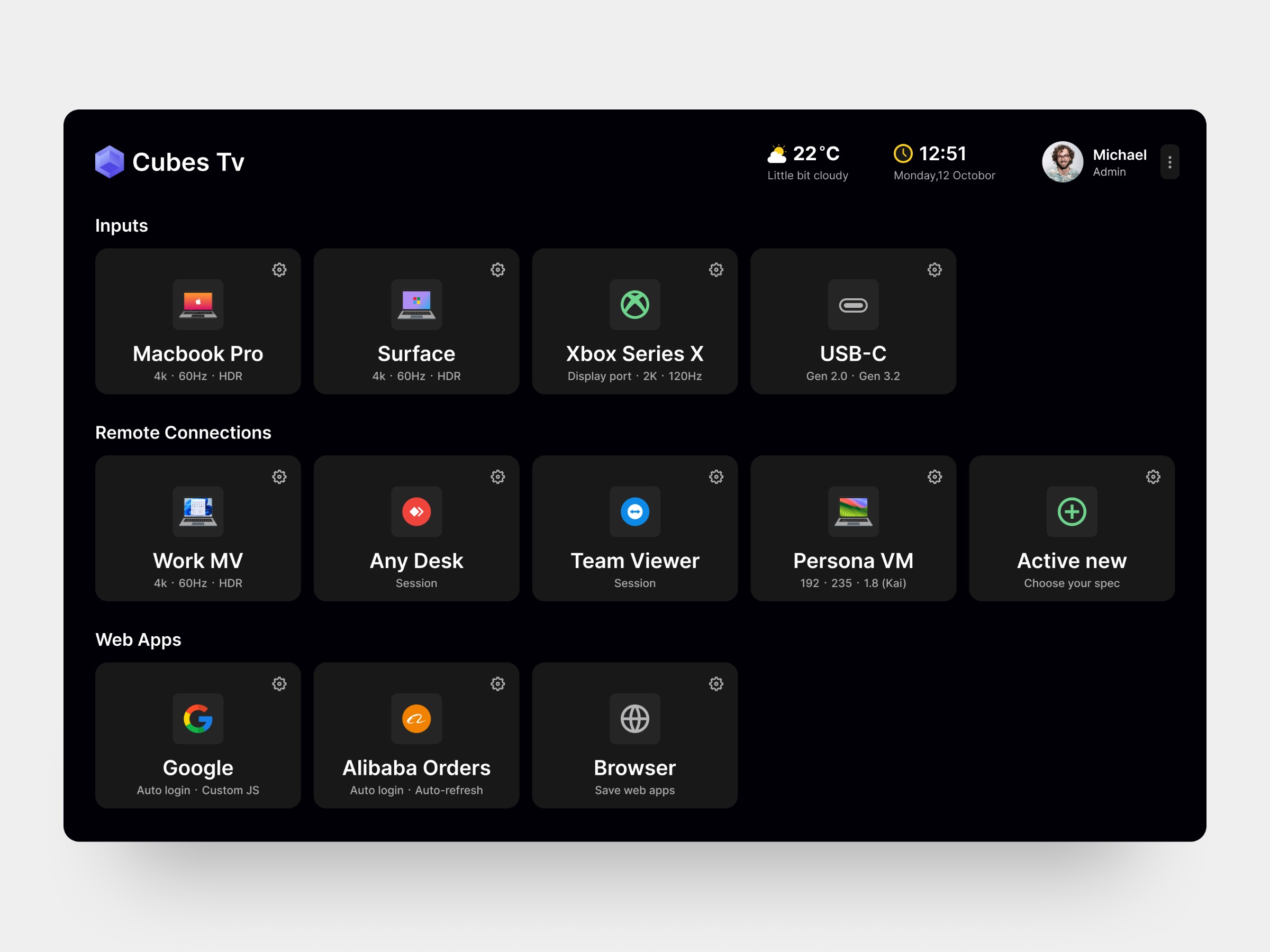 Cubes OS is designed to simplify how users manage devices, remote sessions, and web tools on large screens. This design makes switching between inputs, launching tools, and managing connections far easier, especially for teams that use TVs as control hubs, dashboards, or multi-device workstations. Key Design Highlights → Quick access to all connected inputs (MacBook, Surface, Xbox, USB-C) → Dedicated section for remote sessions like TeamViewer, AnyDesk, and VM dashboards → Web apps organized into tiles with auto-login and custom JS support → Minimal dark UI optimized for distance viewing and high contrast → A grid-based layout that keeps everything neat, consistent, and easy to scan
