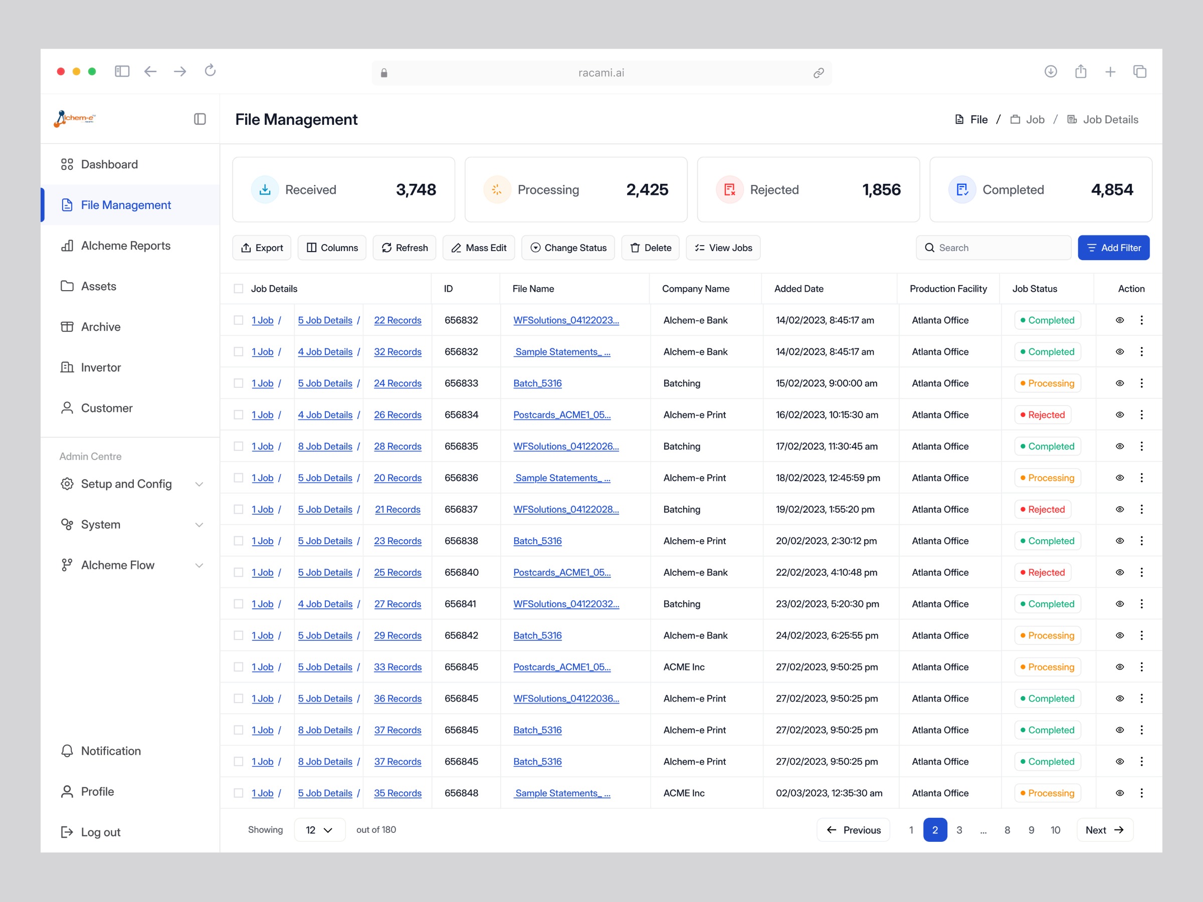 The Racami dashboard is designed to help production teams manage large volumes of file jobs with clarity and control. It centralizes job status, company details, facilities, and timelines. → Organized hub for monitoring received, processing, rejected, and completed jobs → Fast search and filtering to locate any file or batch instantly → Bulk actions for mass edits, status updates, and deletions → Detailed job views with company info, timestamps, and production facility data → Clean, structured interface built for high-volume operational efficiency