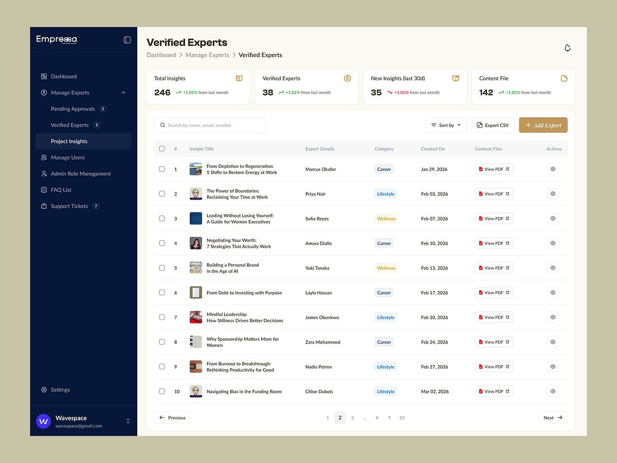 This web application design presents the Expert Insight Dashboard of Expressa AI, a platform where women experts share knowledge and earn royalties. The AI product transforms these insights into actionable guidance for rising women leaders. The SaaS dashboard features a clean, organized web UI, with categories like Career, Lifestyle, and Wellness for easy navigation. This AI platform dashboard ensures a smooth and intuitive experience for users. The management dashboard design effectively uses color and hierarchy to organize content, making it visually clear and accessible. The ui ux layout improves engagement by helping users quickly access and explore valuable insights. Overall, the expert insight page design enhances user interaction by presenting information in an easy-to-digest format, making it simple for users to stay focused on their growth journey with AI support.