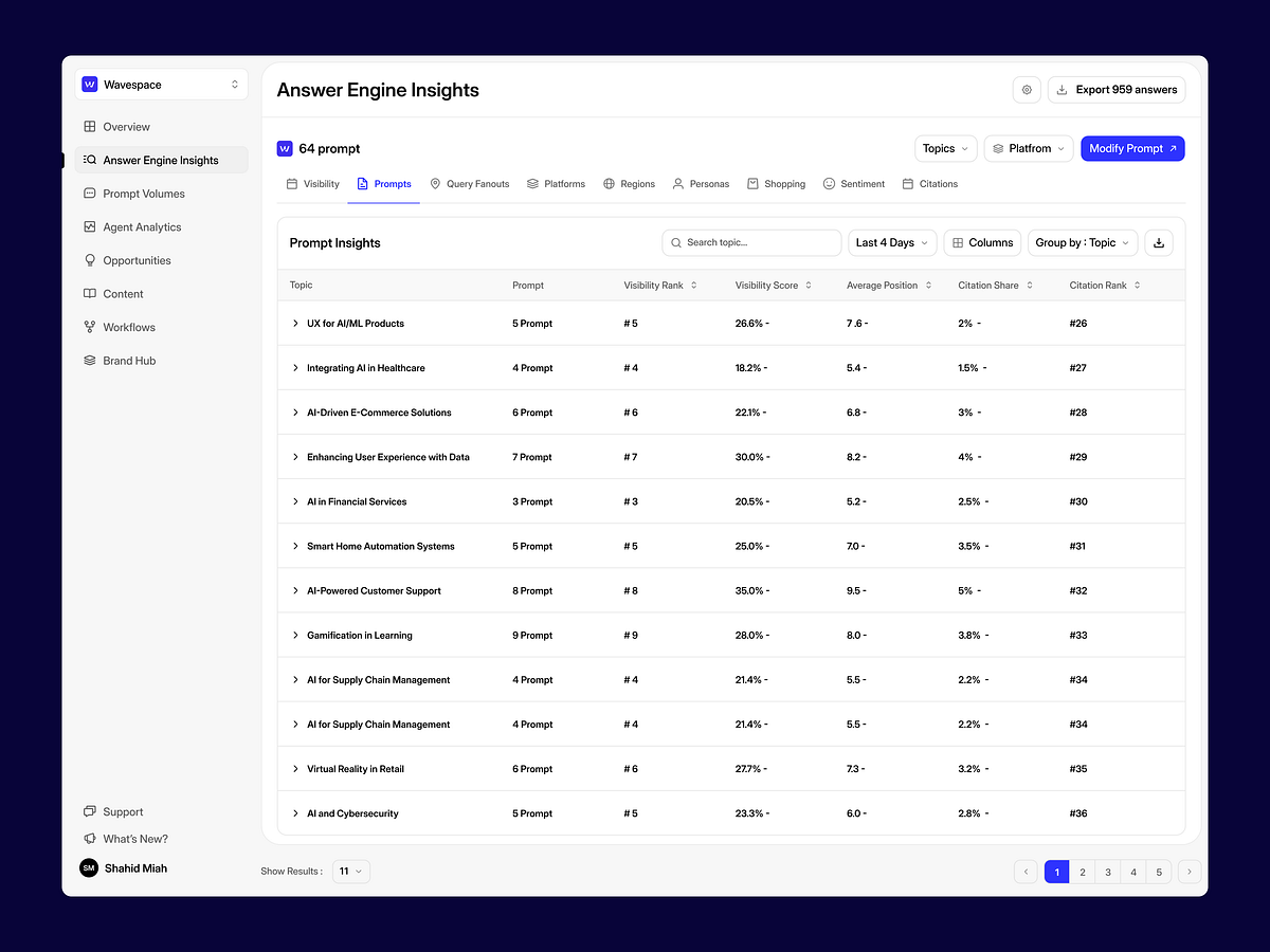 An AI Search Analytics Platform that tracks brand visibility, AI search ranking, and growth across LLM-driven ecosystems. The dashboard works as a Generative Engine Optimization (GEO) Tool and LLM Visibility Tracking Software, turning raw data into clear insights. The structured table layout, topic grouping, and progressive disclosure improve scanability. Visual hierarchy highlights key metrics like visibility score and citation rank. Clean spacing, soft contrast, and modular components reduce cognitive load, helping teams quickly understand performance and act faster on AI search trends.