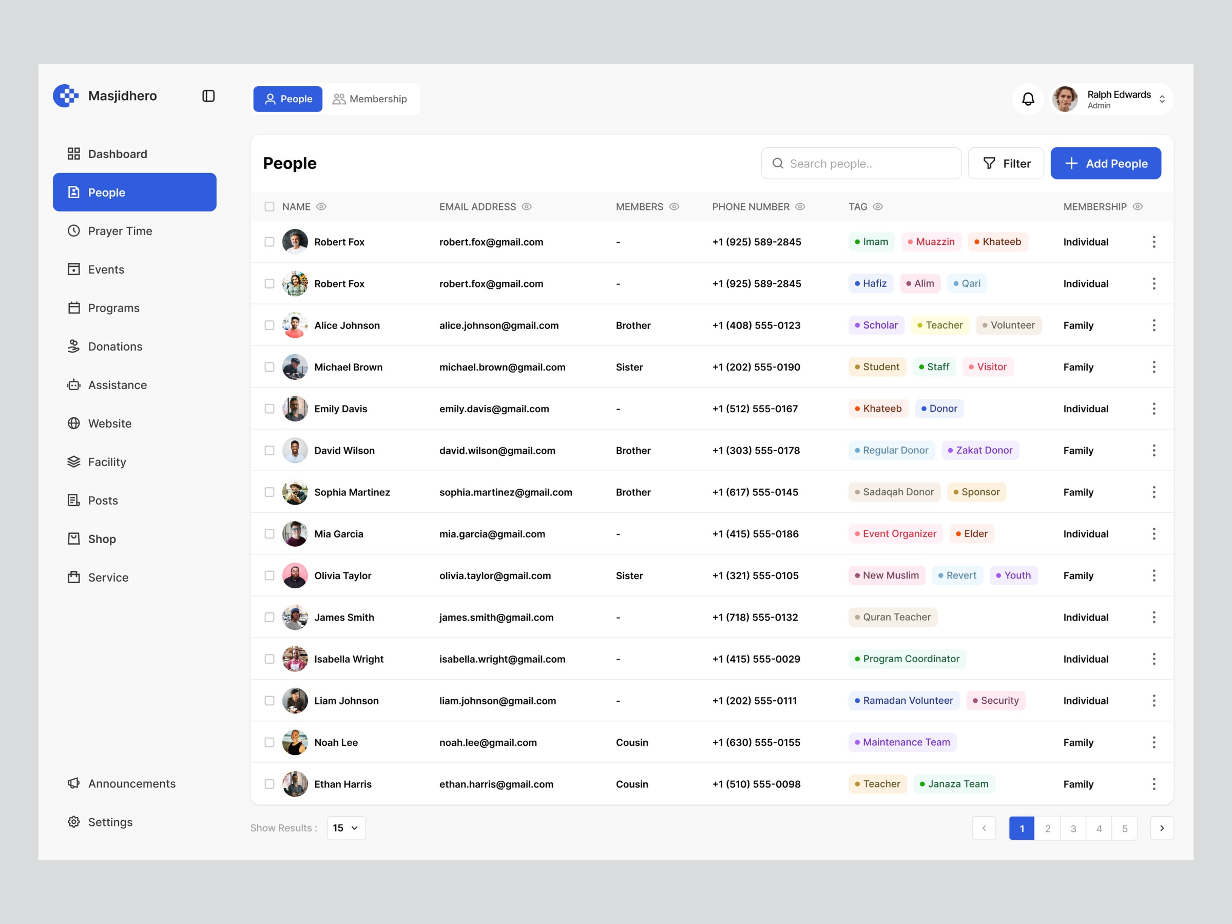 MasjidHero offers a clean, intuitive dashboard for managing mosque community data. Designed for easy navigation and quick access, it streamlines member tracking, donors, and volunteer coordination. With a user-friendly interface and powerful search, administrators can manage community information efficiently and accurately. ✓ Custom tags for roles, donations, and volunteers ✓ Clean, modern dashboard for easy administration ✓ Centralized member database with detailed profiles ✓ Fast search and filter experience for quick data access ✓ Relationship mapping for families and membership types
