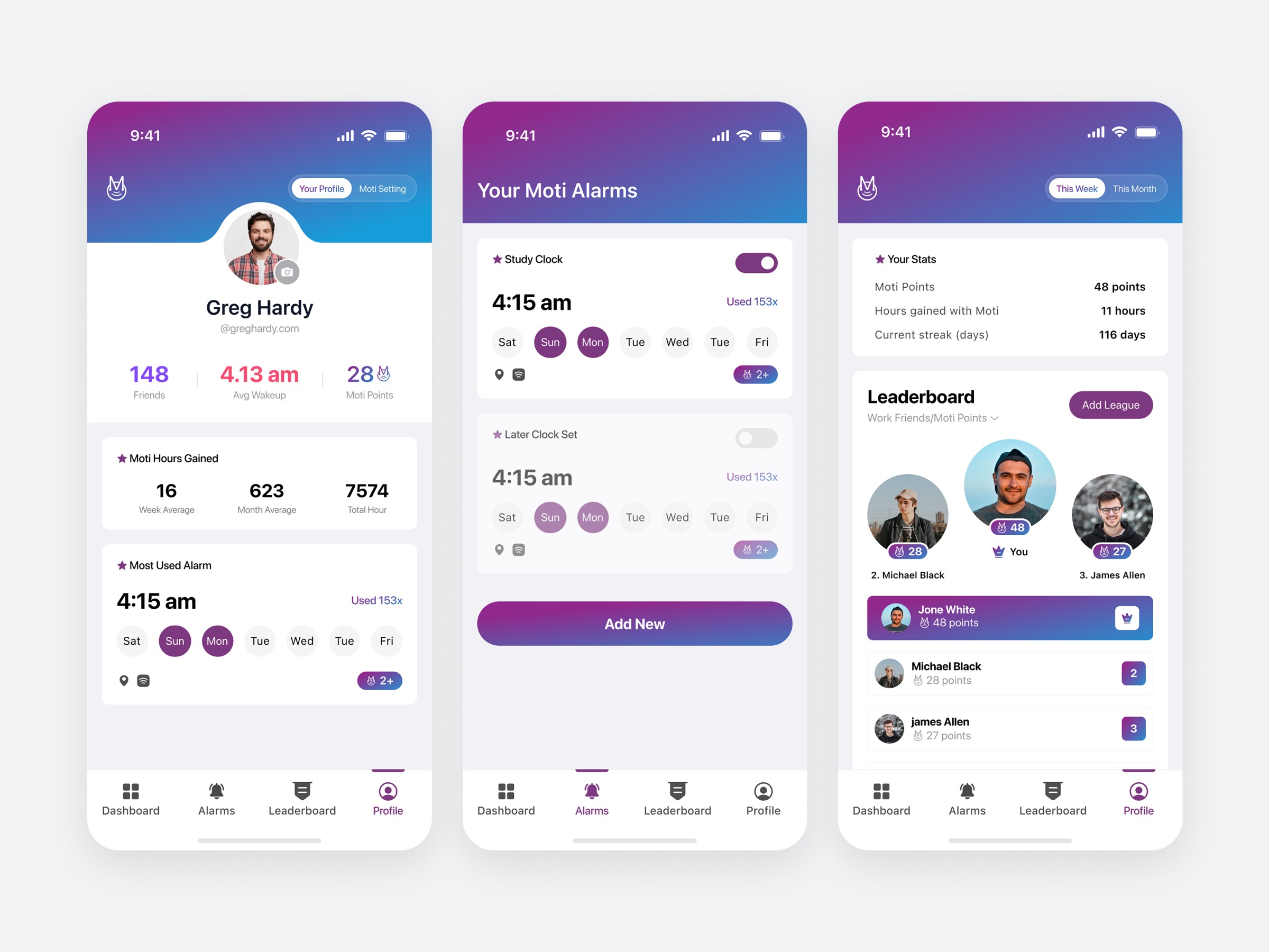 Moti Alarm is designed to help users stay consistent with their routines through smarter alarms, motivational stats, and built-in accountability features. Built with a clean, gradient-driven UI, the app blends habit-tracking with social motivation to keep users engaged every single day. Key Design Highlights → Personalized dashboard showing wake-up stats, streaks, and Moti points → Smart alarms with flexible schedules, sound control, and repeat settings → Motivation-first UI with leaderboards, points, and friend-based challenges → Clean breakdown of hours gained, alarm usage, and progress insights → Soft gradients and minimal layout ensuring calm, friendly usability