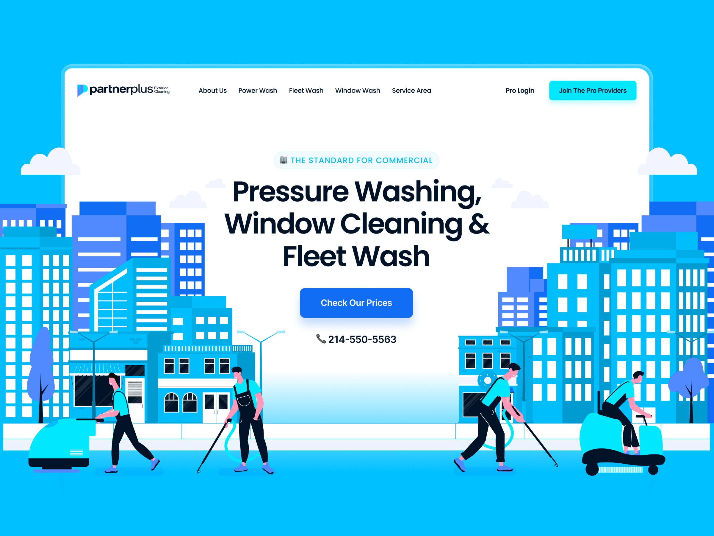 A fresh redesign of the PartnerPlus commercial cleaning website, crafted to boost clarity, trust, and conversions. The new layout highlights key services, showcases partner industries, and guides visitors smoothly toward requesting a quote. Key Design Highlights → A clean, conversion-ready hero section with bold messaging → Custom illustrations to bring the service experience to life → Clear service breakdown for Pressure Wash, Window Wash & Fleet Wash → Industry-specific sections designed for credibility and trust → A mobile-optimized layout for a seamless browsing experience