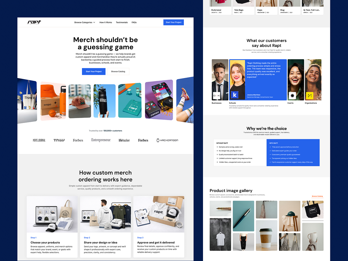 Rapt Clothing is a modern e-commerce web design concept built for brands, teams, and creators who want to create and sell custom merchandise with ease. This landing page design acts as a conversion-focused shopping experience, clearly guiding users through the full journey, from idea to production to delivery within a structured and intuitive flow. Designed for the print-on-demand and custom apparel space, this platform simplifies the process of launching branded merch and managing an online store. The experience is tailored for businesses and creators looking for a seamless e-commerce platform to scale their brand. The interface combines strong UI/UX design principles, including clear visual hierarchy, grid-based layout systems, and prominent call-to-action (CTA) elements. This ensures a smooth user experience (UX) while improving navigation across product discovery, customization, and checkout flows. This modern UI design uses a minimal interface, balanced white space, and bold accent colors to create a clean and engaging look. Built with a scalable design system in mind, the layout supports responsive web design and consistent interactions across devices.