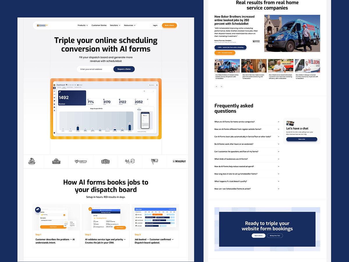 ScheduleBot and AI SaaS landing page designed to maximize lead conversion and automated booking. Focuses on clean, high-performing website design, combining conversion-driven UX, AI forms, and frictionless scheduling flows. Built for home service businesses, the experience highlights an automation-first design that turns website visitors into qualified leads and booked jobs. This web UI emphasizes clear hierarchy, strong CTAs, social proof, and ROI-focused messaging to improve conversion rates and reduce drop-offs.