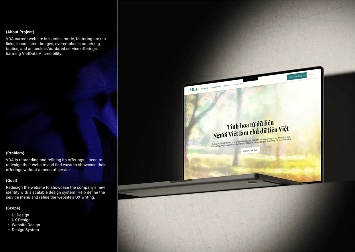 Redesign the website to showcase VDA's new identity with a scalable design system. Help define the service menu and refine the website's design.
