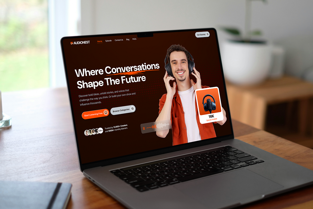 AUDIONEST is a modern podcast platform designed to make discovering and listening to meaningful conversations feel effortless and enjoyable.The idea behind this concept was to create an experience where users can quickly explore new episodes, discover creators, and start listening without friction. Instead of overwhelming users with too many choices, the layout guides attention through clear sections like trending episodes, popular categories, and featured guests, helping users naturally find something that interests them.