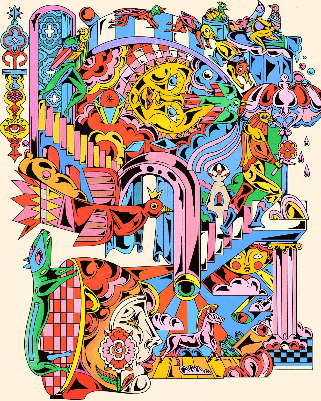 This gallery presents a selection of illustrations, mixing geometric shapes, psychedelic colors, and bold, clean linework.