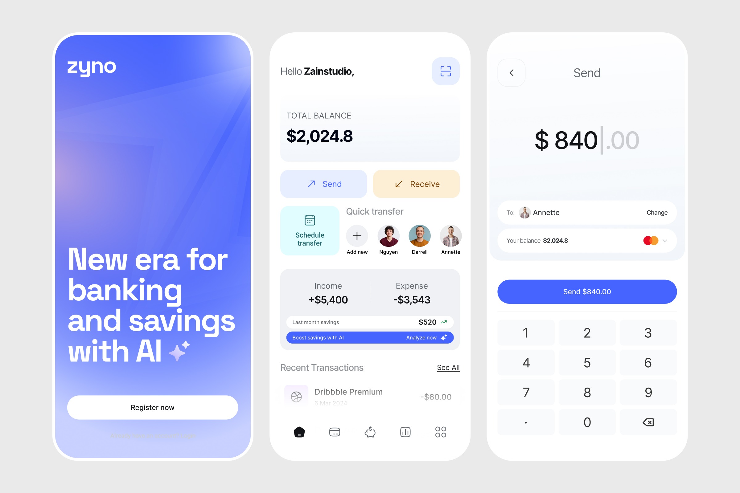 Modern digital banking needs to be fast, simple, and visually clear. This mobile banking UI is designed to help users easily manage their balance, track expenses, and send money in just a few taps. The dashboard highlights total balance, income vs expense insights, quick transfers, and recent transactions, allowing users to stay in control of their finances. The send-money flow is simplified with a clean keypad interface and quick recipient selection to reduce friction. Design Approach: The goal was to create a minimal and user-focused banking experience that prioritizes clarity and fast actions. A clean card-based layout, soft colors, and clear hierarchy help users quickly understand their financial information. Smart design can make financial management feel effortless. 📩 Let’s collaborate: hellozainstudio.craft@gmail.com