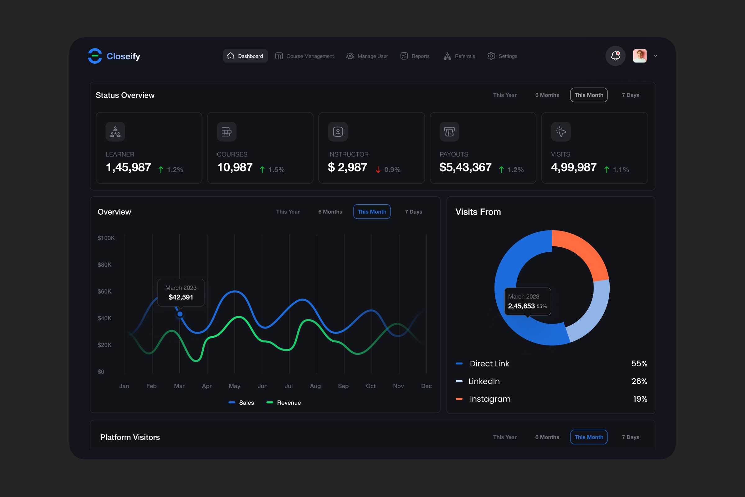 Analytics dashboards without clarity are just noise. When teams can’t instantly understand performance metrics, traffic sources, or growth trends, they end up reacting late instead of making proactive decisions. For this Analytics SaaS Dashboard, the focus was on turning complex data into a clear, real-time decision-making tool. Where many analytics dashboards fall short - Too much data with no clear prioritization - Metrics displayed without actionable context - Poor visual hierarchy that slows down scanning - Disconnected insights across charts and widgets What we did differently This design organizes key metrics like learners, courses, revenue, and visits into a structured overview, giving instant clarity at the top level. Interactive charts provide trend visibility over time, while the traffic source breakdown (Direct, LinkedIn, Instagram) adds context to performance. The dark UI enhances focus, reduces visual fatigue, and highlights data through contrast. Every element is designed to help users understand “what’s happening” and “what to do next” without friction. Outcomes delivered - Faster insight discovery with clear data hierarchy - Better decision-making through contextual visualization - Reduced cognitive load with structured layout - Improved focus with a clean, dark interface Because dashboards shouldn’t just display data — they should drive decisions. Open to feedback and collaboration 🤝 📩 josim.design@gmail.com