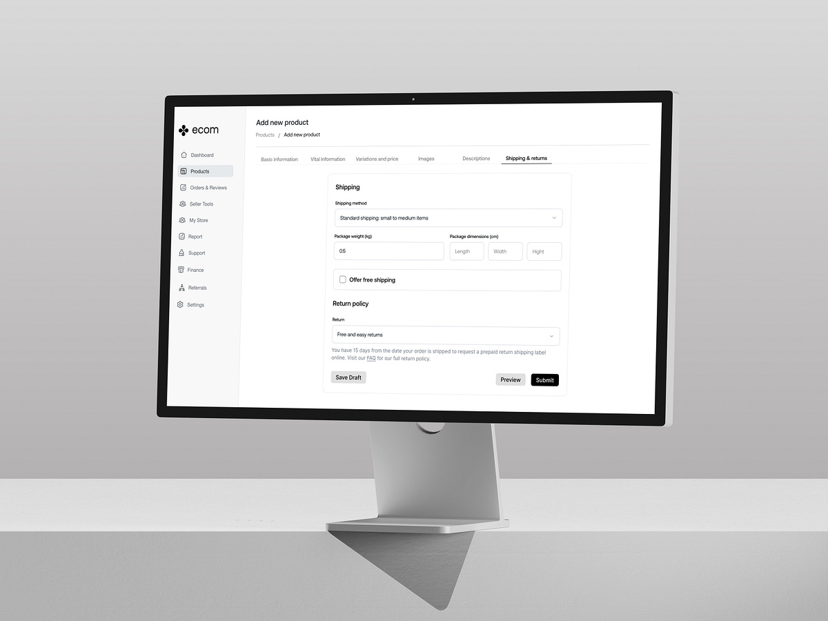Designed a clean and intuitive “Add New Product” flow for an e-commerce dashboard, focusing on the Shipping & Returns section. The goal was to simplify complex inputs like shipping methods, package details, and return policies into a structured, easy-to-scan layout.The interface uses clear hierarchy, soft spacing, and minimal visual noise to help sellers quickly complete tasks without confusion. Key actions like Save Draft, Preview, and Submit are positioned for smooth workflow, while form elements are optimized for usability and clarity.