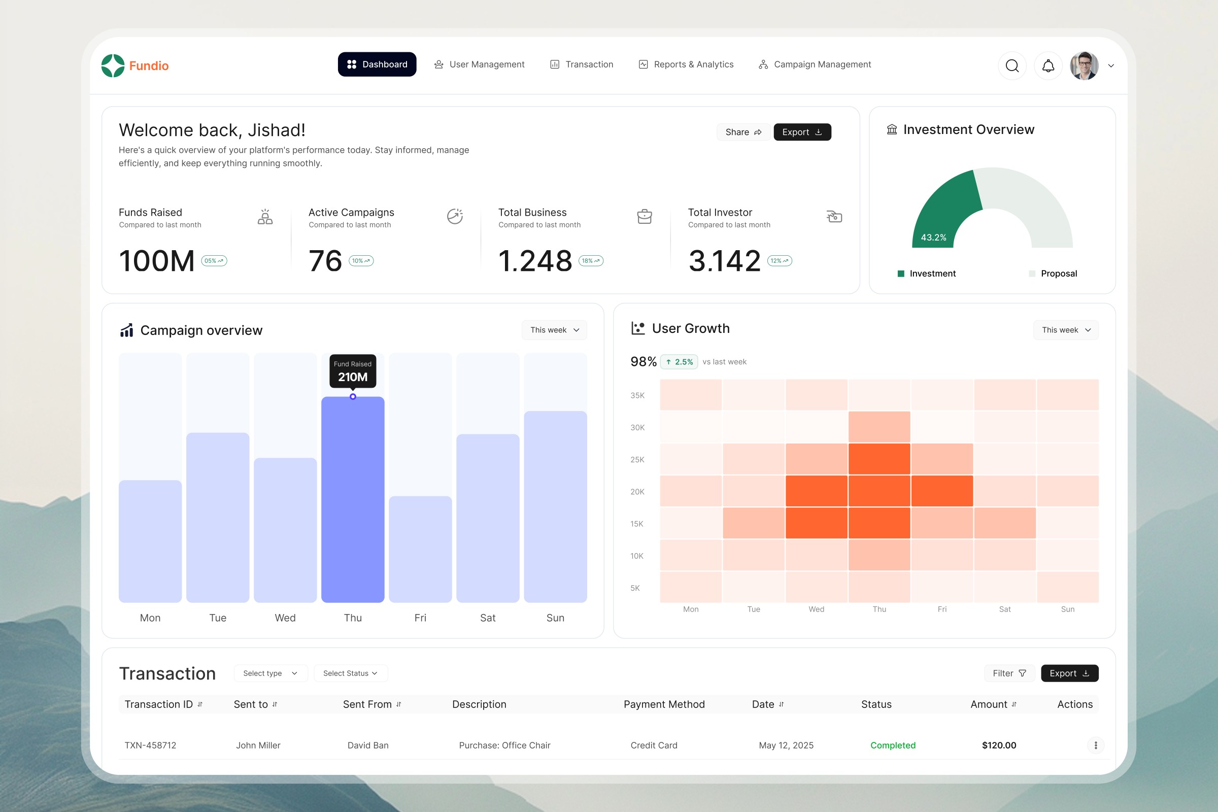 Designed an investment and campaign management dashboard focused on simplifying complex financial data into actionable insights. The goal was to create a clean, structured interface where users can quickly understand platform performance — from funds raised to campaign activity and user growth without feeling overwhelmed. Key design decisions: • Strong visual hierarchy for quick scanning • Balanced use of charts (bar + heatmap) for better insights • Clear KPI sections for instant performance tracking • Minimal, distraction-free layout for financial clarity • Action-ready components like export, filter, and share This dashboard is built to help teams make faster, data-driven decisions while maintaining a smooth and intuitive experience. 📩 hellozainstudio.craft@gmail.com